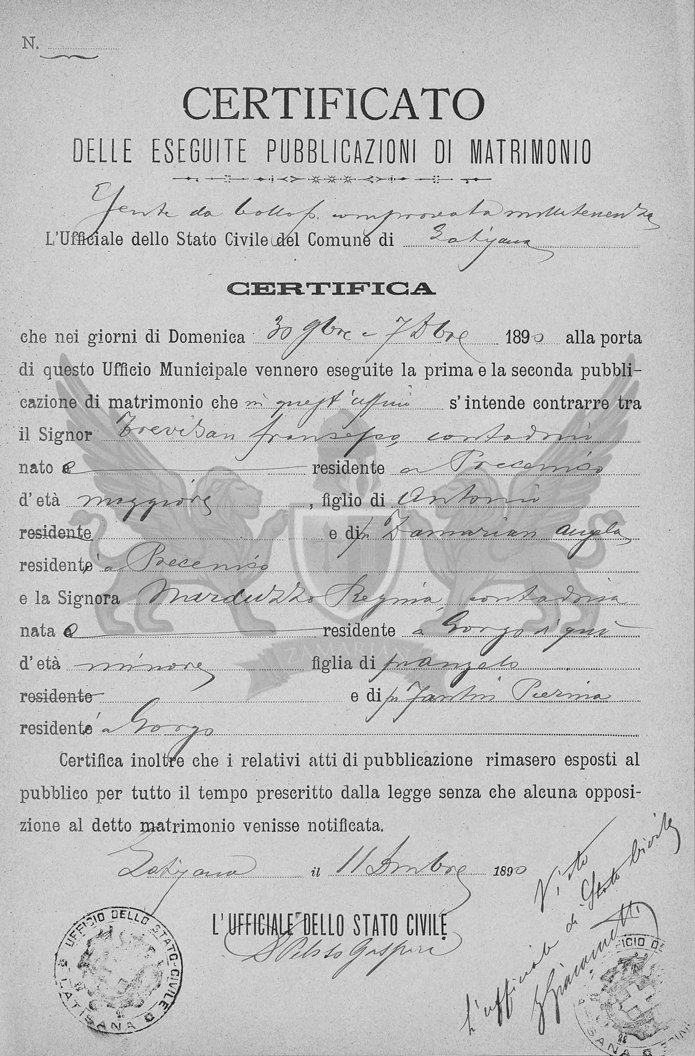 Que nos dias de Domingo 30 outubro e 7 de dezembro de 1890 à porta deste Ofício Municipal foram exibidos a primeira e segunda publicações de matrimônio que neste Ofício se intende contrair entre o Senhor Senhor Trevisan Francesco, camponês nascido e residente em Precenicco, de idade maior, filho de Antonio e da falecida Zamarian Angela, residentes em Precenicco e a Senhora Narduzzo Regina, camponesa, nascida e residente em Gorgo daqui, de idade menor, filha do falecido Angelo e falecida Fantin Pierina, residentes em Gorgo.