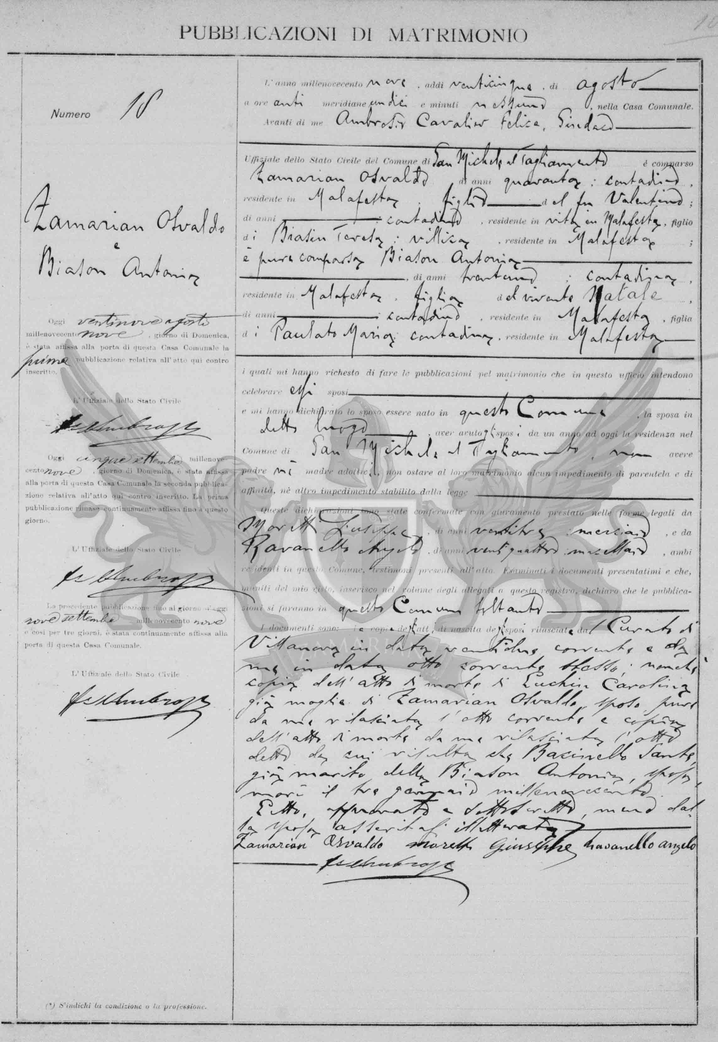 Diante de mim Ambrosio Cavalier Felice, Síndico, Oficial do Registro Civil do Município de San Michele Al Tagliamento, compareceu Zamarian Osvaldo, de quarenta anos, *camponês, residente em Malafesta, filho do finado Valentino; camponês, residente em Malafesta, filho de Biasin Teresa, camponesa, residente em Malafesta; também compareceu Biason Antonia, de trinta e um anos, *camponesa, residente em Malafesta, filha do vivente Natale, *camponês residente em Malafesta, filha de Paulato Maria, camponesa, residente em Malafesta, os quais me solicitaram de fazer as publicações para matrimônio que neste ofício intendem celebrar - e me declararam o nubente ser nascido neste município, a nubente no citado lugar, haver os nubentes pelo menos há um ano no Município de San Michele Al Tagliamento, não ter pai nem mãe adotivos, não haver nenhum impedimento ao matrimônio de parentesco ou de afinidade, nem outro obstáculo estabelecido pela lei.