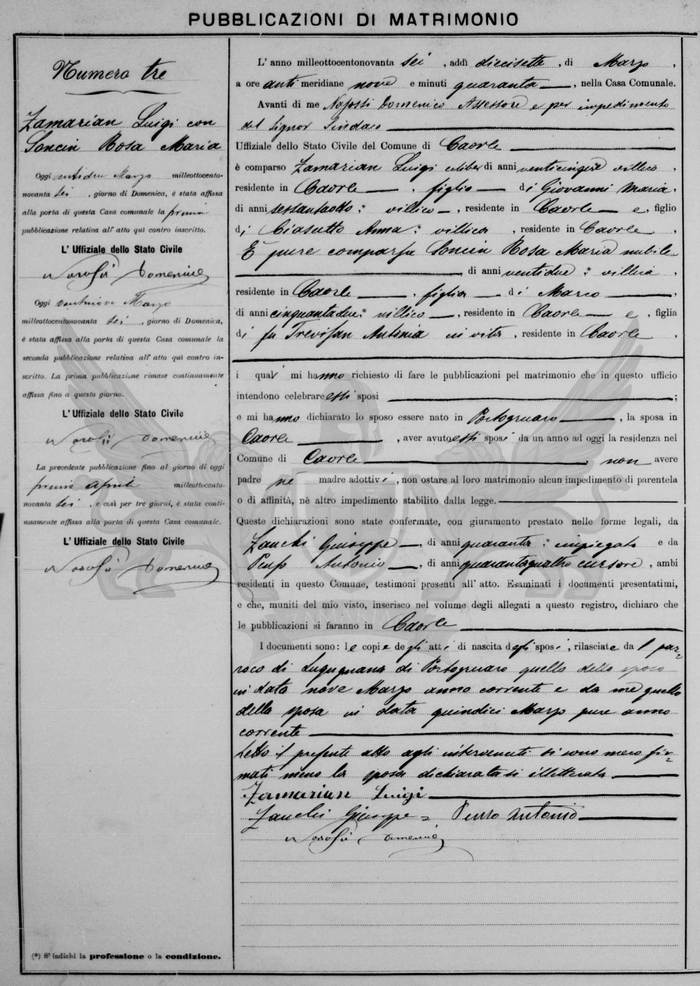 Diante de mim Nasossi Domenico, assessor e por impedimento do Senhor Síndico Oficial do Estado Civil do Município de Caorle compareceu Zamarian Luigi, solteiro, de vinte e cinco anos, *camponês, residente em Caorle, filho de Giovanni Maria, de sessenta e oito anos, *camponês, residente em Caorle e filho de Chiasutto Anna, camponesa, residente em Caorle; e também Soncin Rosa Maria, solteira, de vinte e dois anos, *camponesa, residente em Caorle, filha de Marco, de cinquenta e dois anos, *camponês residente em Caorle e filha da falecida Trevisan Antonia, residente em vida em Caorle, os quais me requereram de elaborar as publicações para matrimônio que neste ofício intendem celebrar esses esposos e me declararam o esposo ter nascido em Portogruaro, a esposa em Caorle, terem tido esses nubentes um ano de residência no Município de Caorle, não possuírem pré mães adotivas, não ter impedimento algum para o matrimônio parentesco ou afinidade, nem objeções estabelecidas pela lei. O documentos são: as cópias dos atos de nascimento dos nubentes, emitidas pelo pároco de Lugugnana, Portogruaro a do esposo em nove de março corrente ano e por mim aquela da esposa em data de quinze de março do mesmo ano corrente.