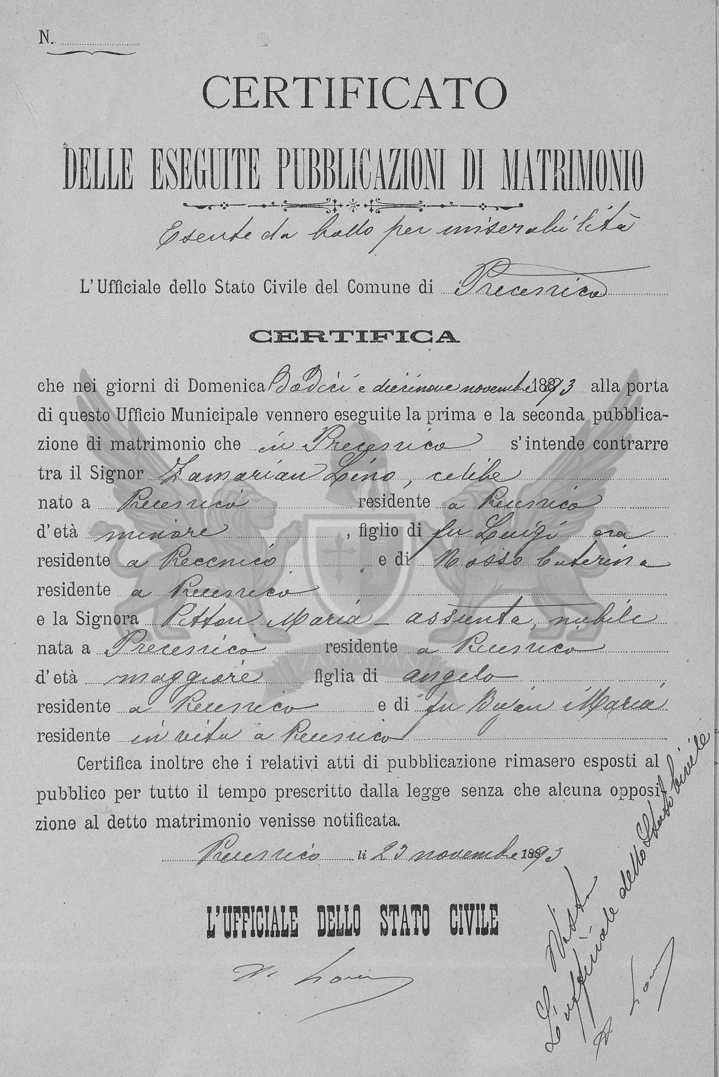 Que nos dias de Domingo vinte e vinte e sete de novembro de 1892 à porta deste Ofício Municipal foram exibidos a primeira e segunda publicações de matrimônio que neste Ofício se intende contrair entre o Senhor Senhor Zamarian Lino, de profissão agricultor, nascido em Precenicco, onde é residente, de idade menor, filho do falecido Luigi, agricultor e de Rosso Caterina, agricultora, residentes em Precenicco, e a Senhora Pitton Maria Assunta de condição agricultora, nascida em Precenicco e onde é residente, de idade maior, filha de Angelo, agricultor residente me Precenicco e da falecida Bujan Maria, agricultora, residente em vida em Precenicco.