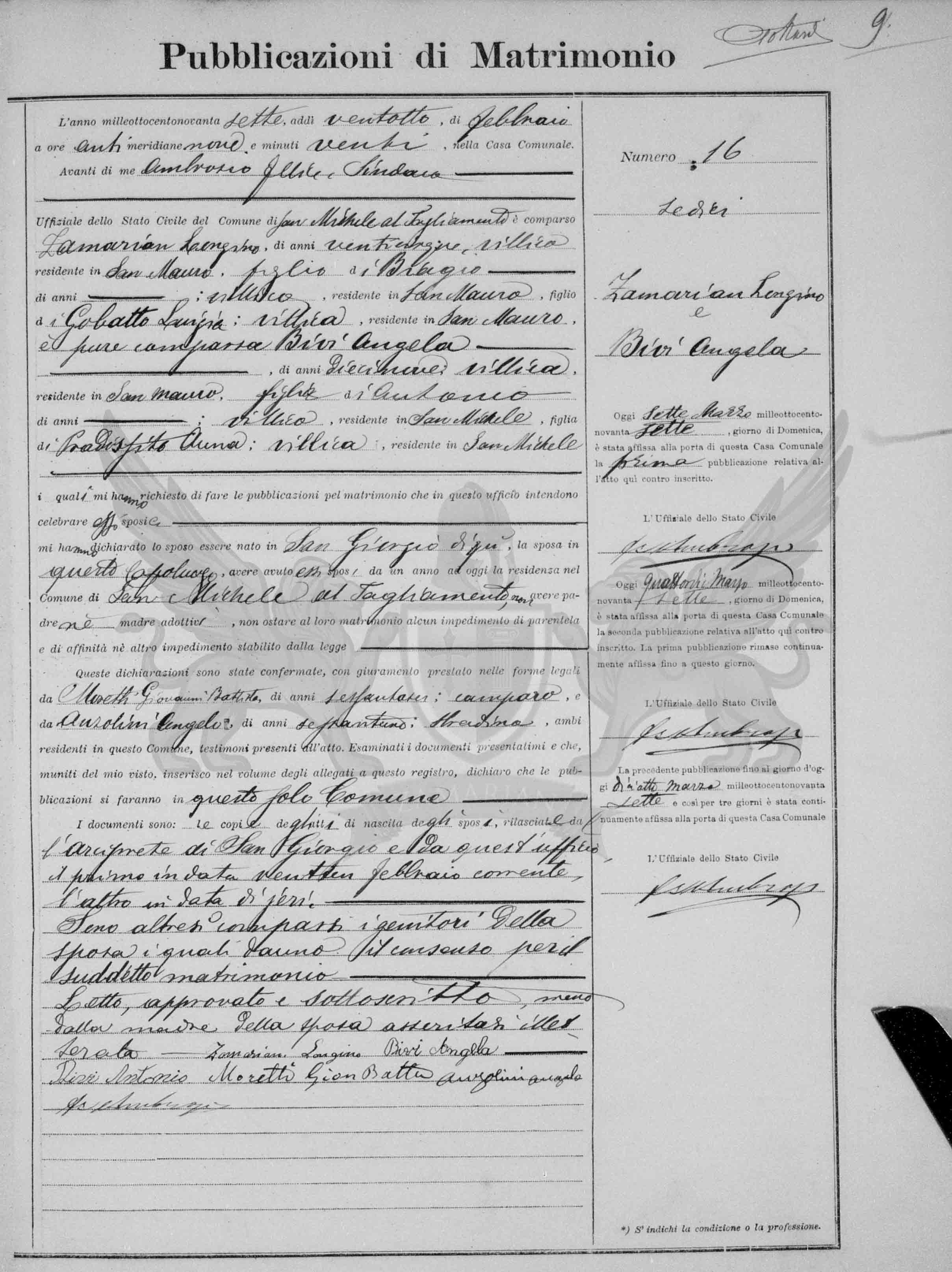 Diante de mim Ambrosio Felice Síndico Oficial do Estado Civil de San Michele al Tagliamento, compareceu Zamarian Longino, de vinte e cinco anos, *camponês, residente em San Mauro, filho de Biagio, camponês, residente em vida em San Mauro, e de Gobbatto Luigia, camponesa, residente em San Mauro; e também compareceu Bivi Angela, de dezenove anos, *camponesa, residente em San Mauro, filha de Antonio, camponês residente em San Michele, e de Pradissito Anna, camponesa residente em San Michele, os quais me requereram para fazer as publicações para o matrimônio que neste ofício intentem celebrar esses nubentes e me declararam o esposo de ter nascido em San Giorgio daqui, a esposa neste local, terem um ano de residência em San Michele al Tagliamento, não possuírem pai nem mãe adotivos, não possuir impedimentos ao seu matrimônio, parentesco entre si, nem outro obstáculo estabelecido em lei.