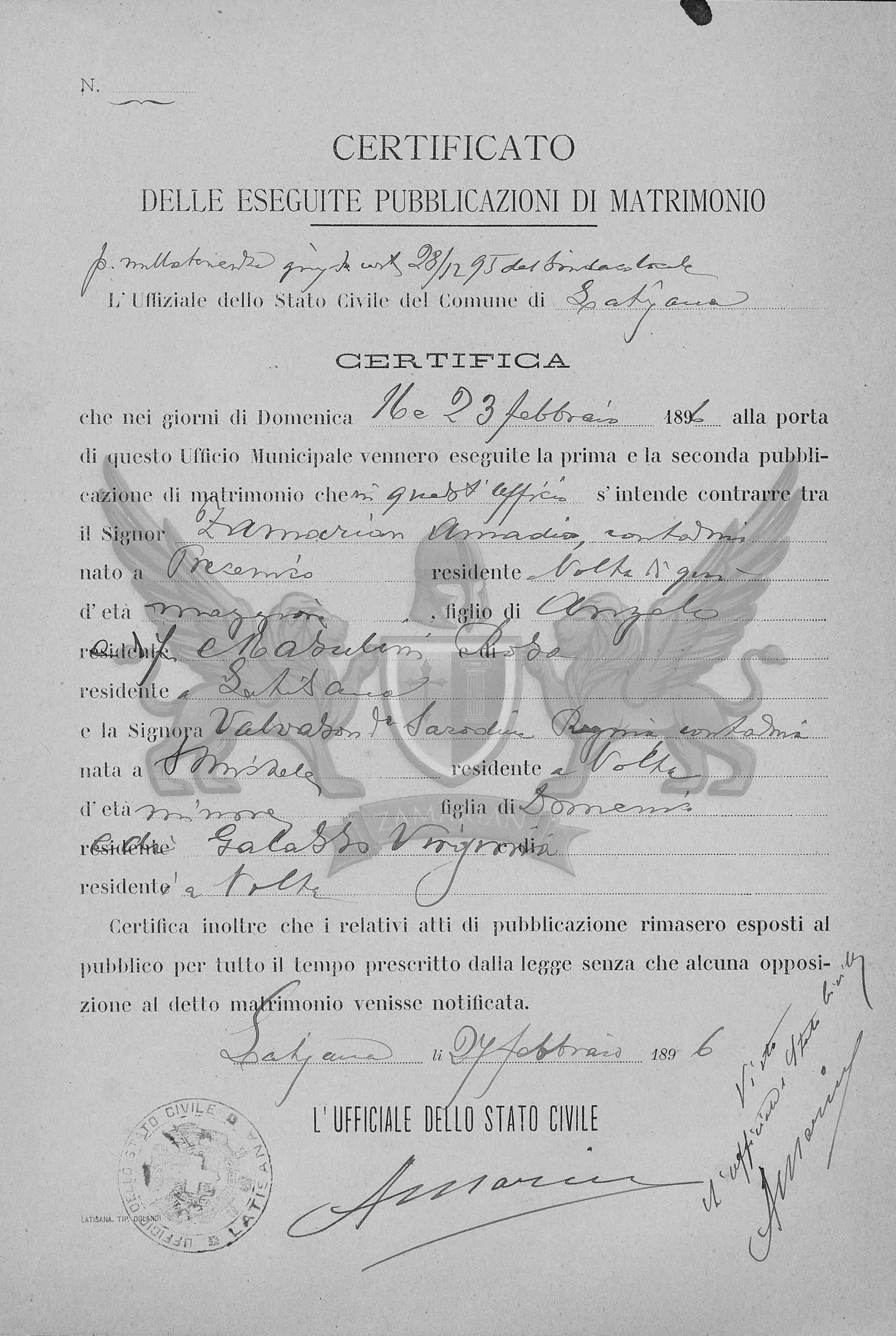 Que nos dias de Domingo 16 e 23 de Maio de 1896 à porta deste Ofício Municipal foram exibidos a primeira e segunda publicações de matrimônio que neste Ofício se intende contrair entre o Senhor Senhor Zamarian Amadio, Camponês, nascido em Precenicco, residente em Volta de idade maior, filho de Angelo e da finada Masolini Rosa, residentes em Latisana e a Senhora Valvason dito Sarodine Regina, Camponesa, nascida em San Michele al Tagliamento, residente em Volta, de idade menor, filha de Domenico e de Galasso Virginia residentes em Volta.