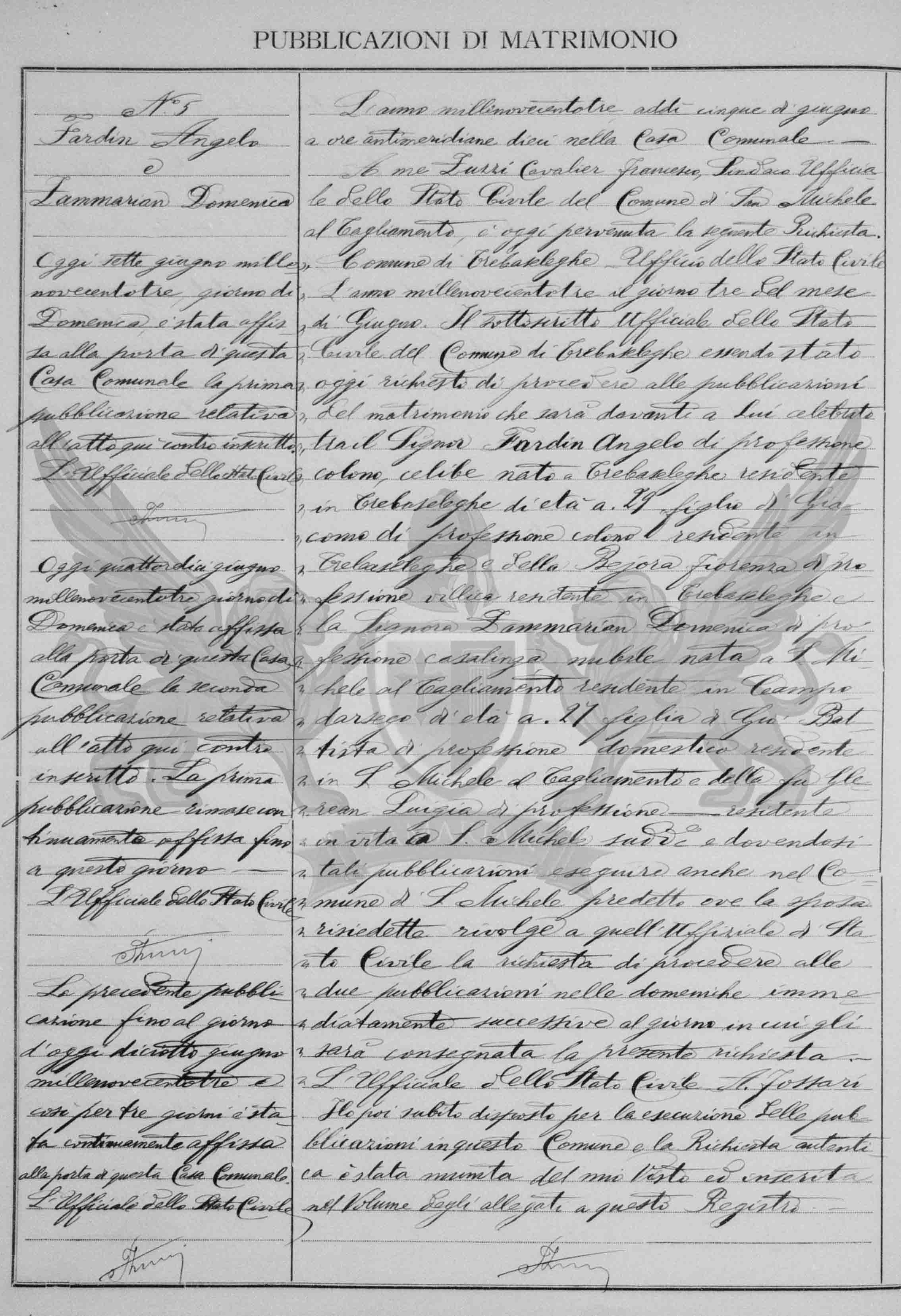 Município de Trebaseleghe Ofício do Registro Civil ano de mil novecentos e três dia três do mês de junho. O subscrito oficial do Registro Civil do Município de Trebaseleghe sendo requerido hoje de proceder às publicações do matrimônio que será no futuro celebrado entre o Senhor Fardin Angelo de profissão colono, solteiro nascido em Trebaseleghe residente em Trebaseleghe, de 29 anos de idade filho de Giacomo, de profissão colono, residente em Trebaseleghe, e de Bejora Fiorenza de profissão camponesa residente em Trebaseleghe e a Senhora Zammarian Domenica, de profissão dona de casa solteira nascida em S. Michele al Tagliamento residente em Campodarsego de 27 anos de idade filha de Gio Battista de profissão doméstico residente em S Michele al Tagliamento pré citado onde a nubente reside pede àquele ofício de Registro Civil o requerimento de proceder às duas publicações nos domingos imediatamente sucessivos ao dia no qual foi solicitada o presente pedido.