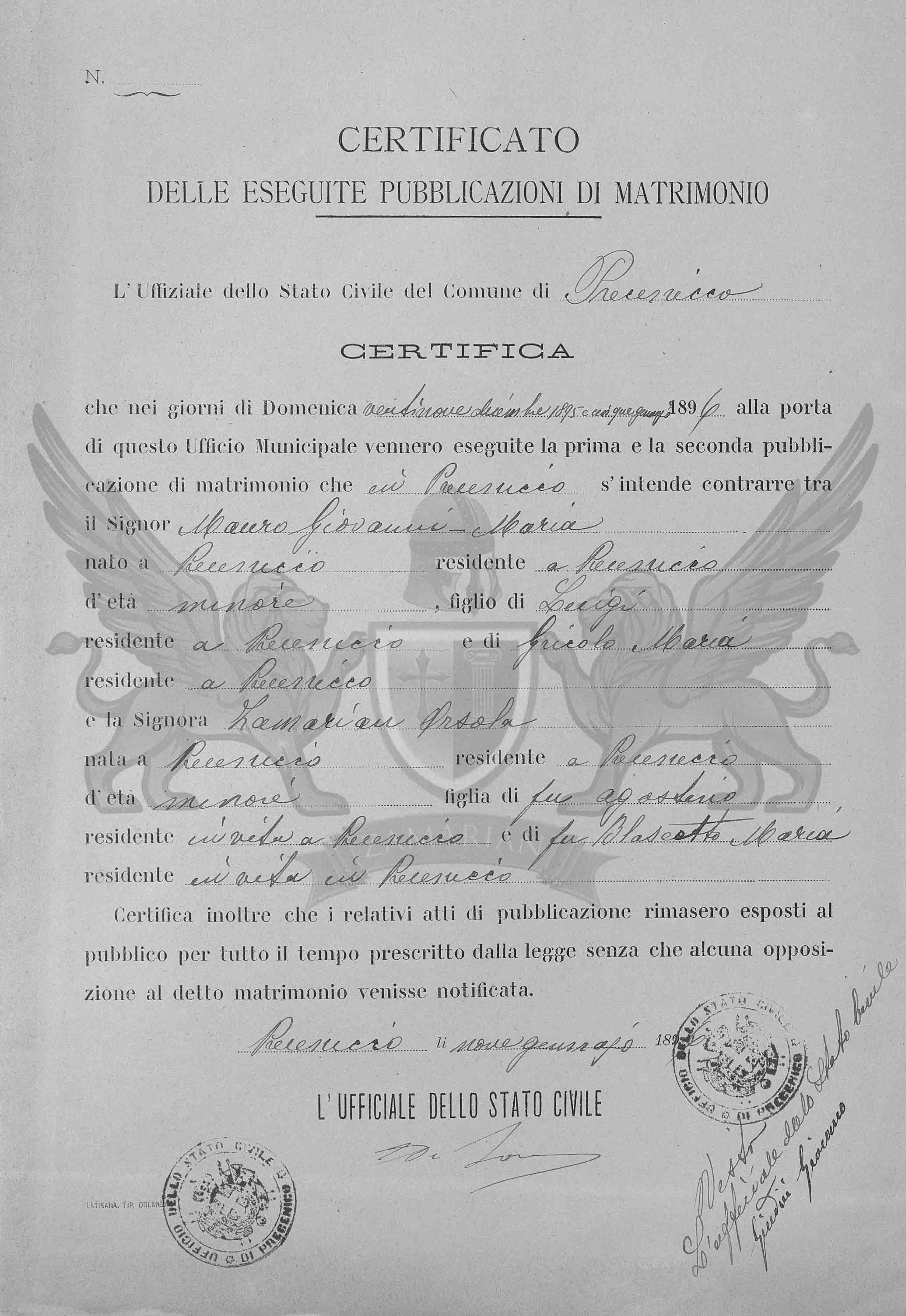 Que nos dias de Domingo vinte e nove de dezembro de 1895 e cinco de janeiro de 1896 à porta deste Ofício Municipal foram exibidos a primeira e segunda publicações de matrimônio que neste Ofício se intende contrair entre o Senhor Senhor Mauro Giovanni Maria, nascido em Precenicco, residente em Precenicco, de idade menor, filho de Luigi, residente em Precenicco e de Gricolo Maria, residente em Precenicco, e a Senhora Zamarian Orsola, nascida em Precenicco, residente em Precenicco, de idade menor, filha do falecido Agostino, residente em vida em Precenicco e da falecida Blaseotto Maria, residente em vida em Precenicco.