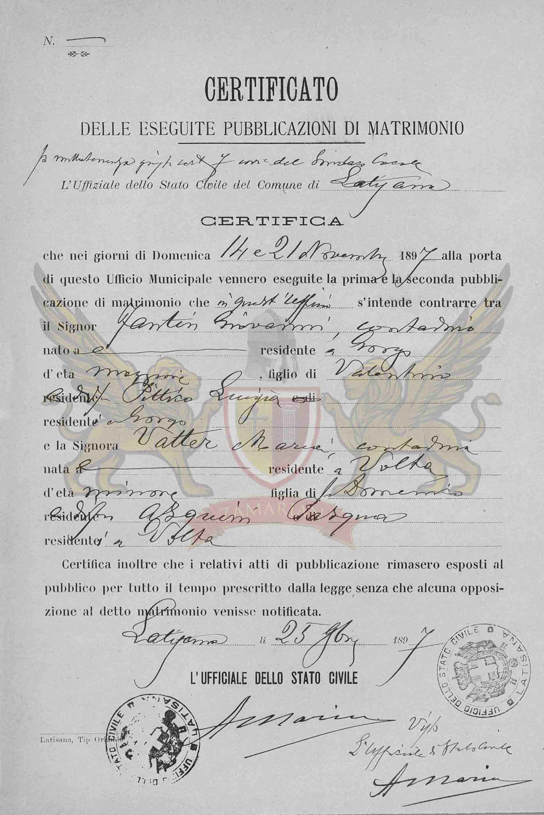 Que nos dias de Domingo14 e 21 de novembro de 1897 à porta deste Ofício Municipal foram exibidos a primeira e segunda publicações de matrimônio se intende contrair neste ofício entre o Senhor Fantin Giovanni, camponês, nascido e residente em Gorgo, de idade maior, filho de Valentonio e de Pittico Luigia e da Senhora Vatter Maria, nascida em Precenicco, residente em Volta, de idade menor, filha do falecido Domenico e da falecida Asquini Pasqua, residentes em Volta.