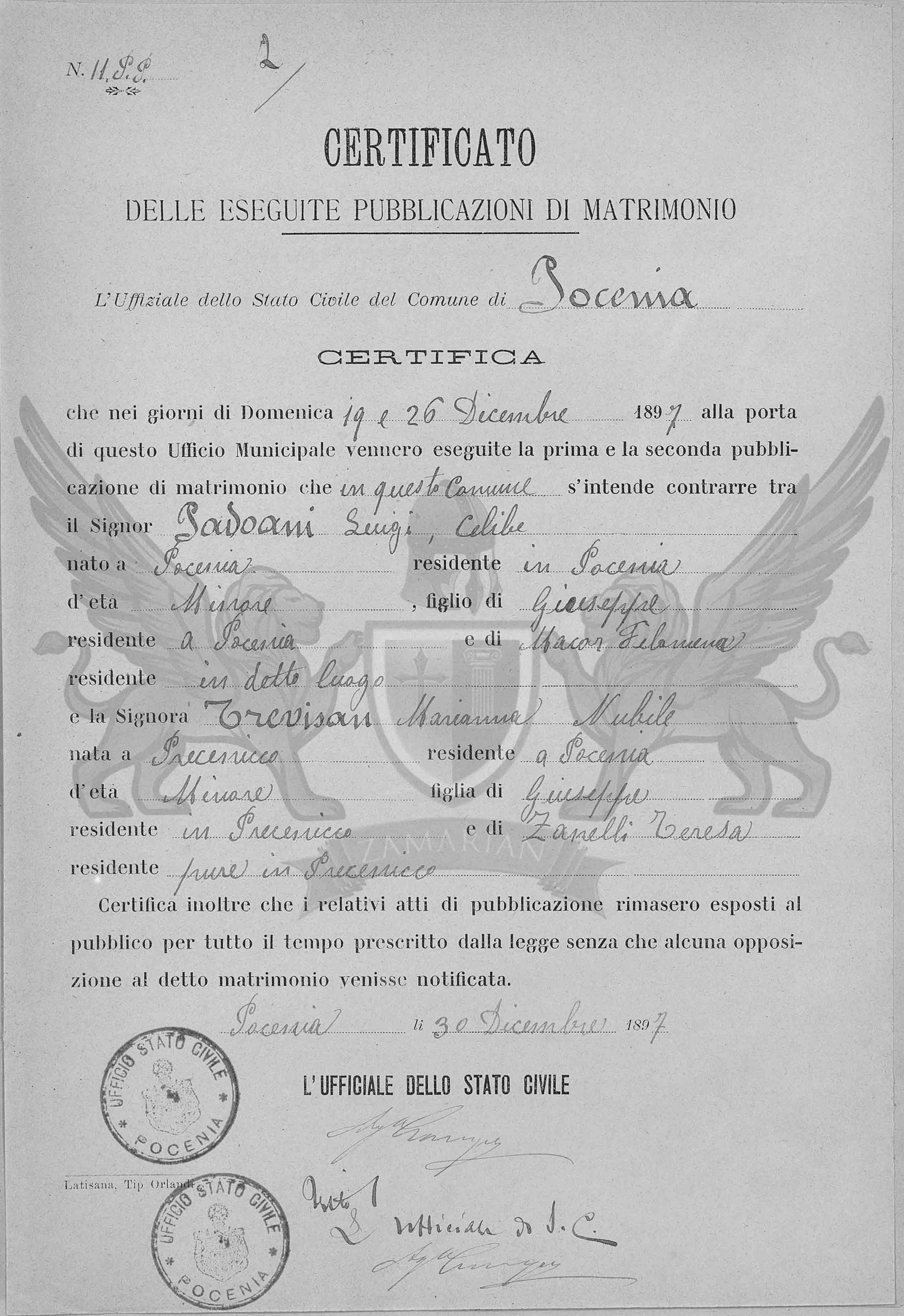 Que nos dias de Domingo vinte e dois e dezenove e vinte e seis de dezembro de 1897 à porta deste Ofício Municipal foram exibidos a primeira e segunda publicações de matrimônio se intende contrair em Precenicco entre o Senhor Padoani Luigi, solteiro, nascido em Pocenia, residente em Pocenia de idade menor filho de Giuseppe residente em Pocenia e de Macor Filomena, residente em Pocenia e a Senhora Trevisan Marianna, solteira, nascida em Precenicco, residente em Pocenia, de idade menor, filha de Giuseppe, residente em Precenicco e Zanelli Teresa, residente em Precenicco.