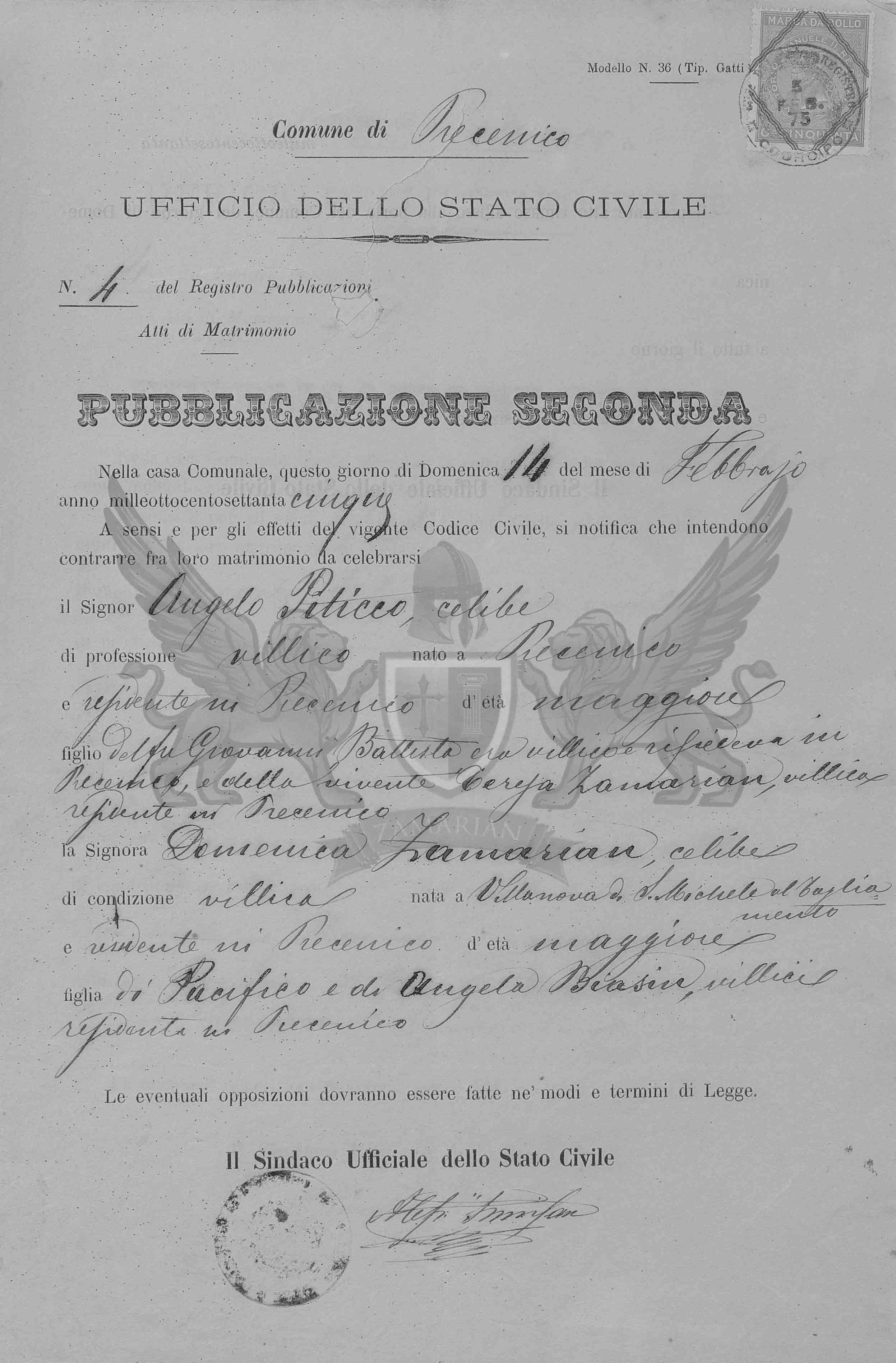 A sensos e pelos efeitos do vigente Código Civil, se notifica que intendem contrair matrimônio entre eles a celebrar o Senhor Angelo Piticco, solteiro e camponês, nascido em Precenicco e residente em Precenicco, de idade maior, filho do falecido Giovanni Battista era camponês e residia em Precenicco e da vivente Teresa Zamarian, camponesa residente em Precenicco e a Senhora Domenica Zamarian, solteira de condição camponesa, nascida em Villanova de San Michele al Tagliamento e residente em Precenicco, de idade maior, filha de Pacifico e de Angela Biasin, camponeses, residentes em Precenicco.