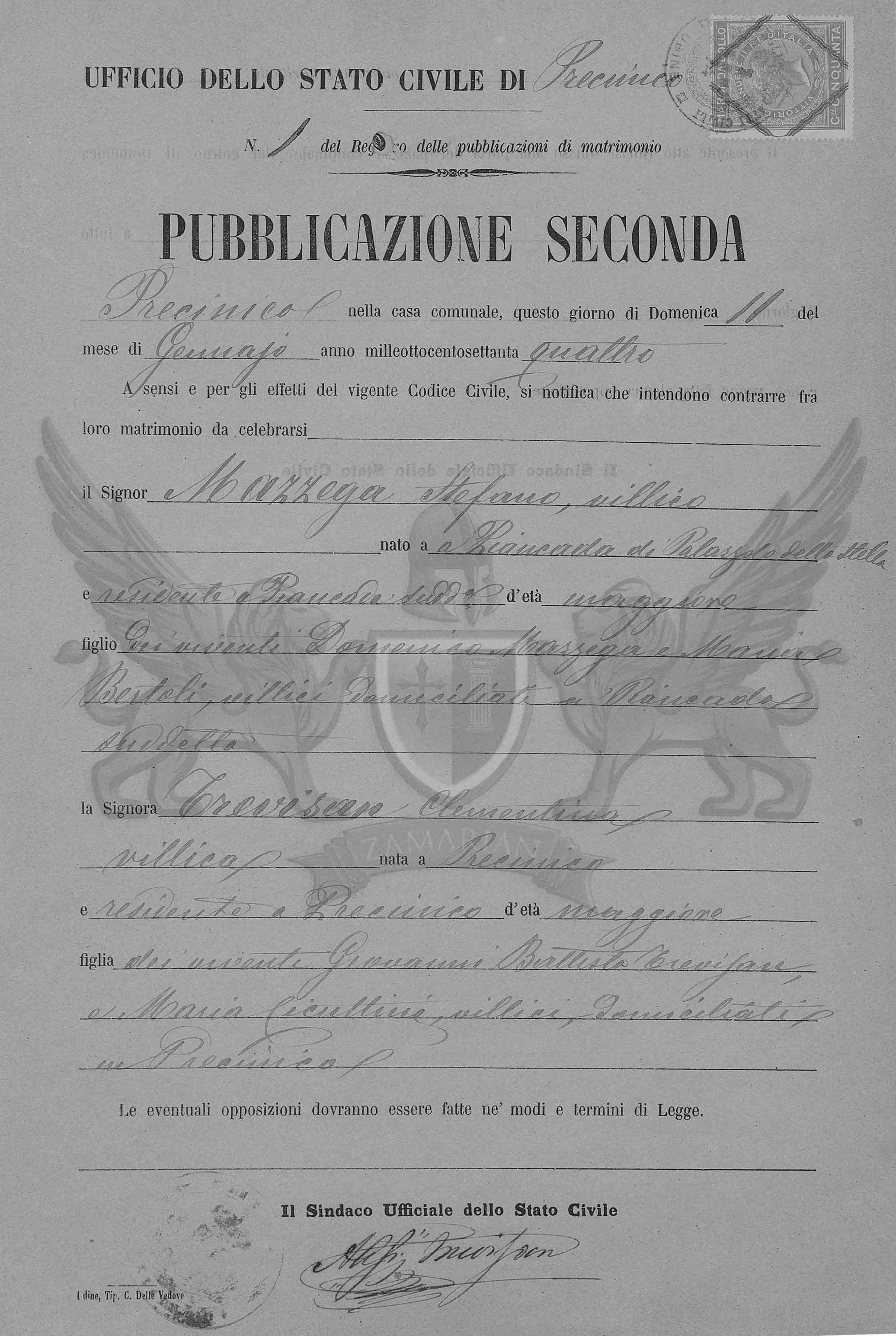 A sensos e pelos efeitos do vigente Código Civil, se notifica que ontem contrair matrimônio entre eles a celebrar neste Ofício o Senhor Stefano Mazzega, solteiro, nascido em Piancada de Palazzolo dello Stella e residente em Piancada supracitada, de idade maior, filho dos viventes Domenico Mazzega e Maria Bertoli, camponeses e domiciliados em Piancada supracitada e a Senhora Clementina Trevisan, camponesa, nascida em Precenicco e residente em Precenicco, de idade maior, filha dos viventes Giovanni Battista Trevisan e Maria Cicuttini, camponeses domiciliados em Precenicco.