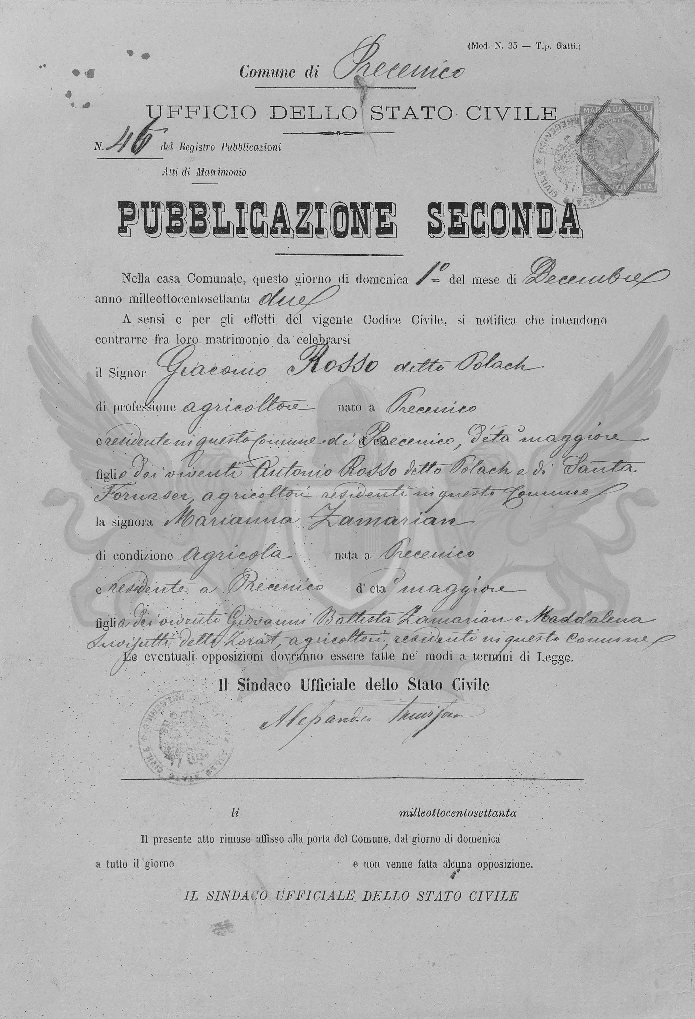 A sensos e pelos efeitos do vigente Código Civil, se notifica que ontem contrair matrimônio entre eles a celebrar neste Ofício o Senhor Giacomo Rosso conhecido Polach de profissão agricultor nascido em Precenicco, e residente neste Município de Precenicco, de idade maior, filho dos viventes Antonio Rosso conhecido Polach e de Santa Fornasier, agricultores, residentes neste Município e a Senhora Marianna Zamarian de condição agricultora, nascida em Precenicco e residente em Precenicco, de idade maior, filha dos viventes Giovanni Battista Zamarian e Maddalena Luvisutti conhecida Zorat, agricultores residentes neste Município.