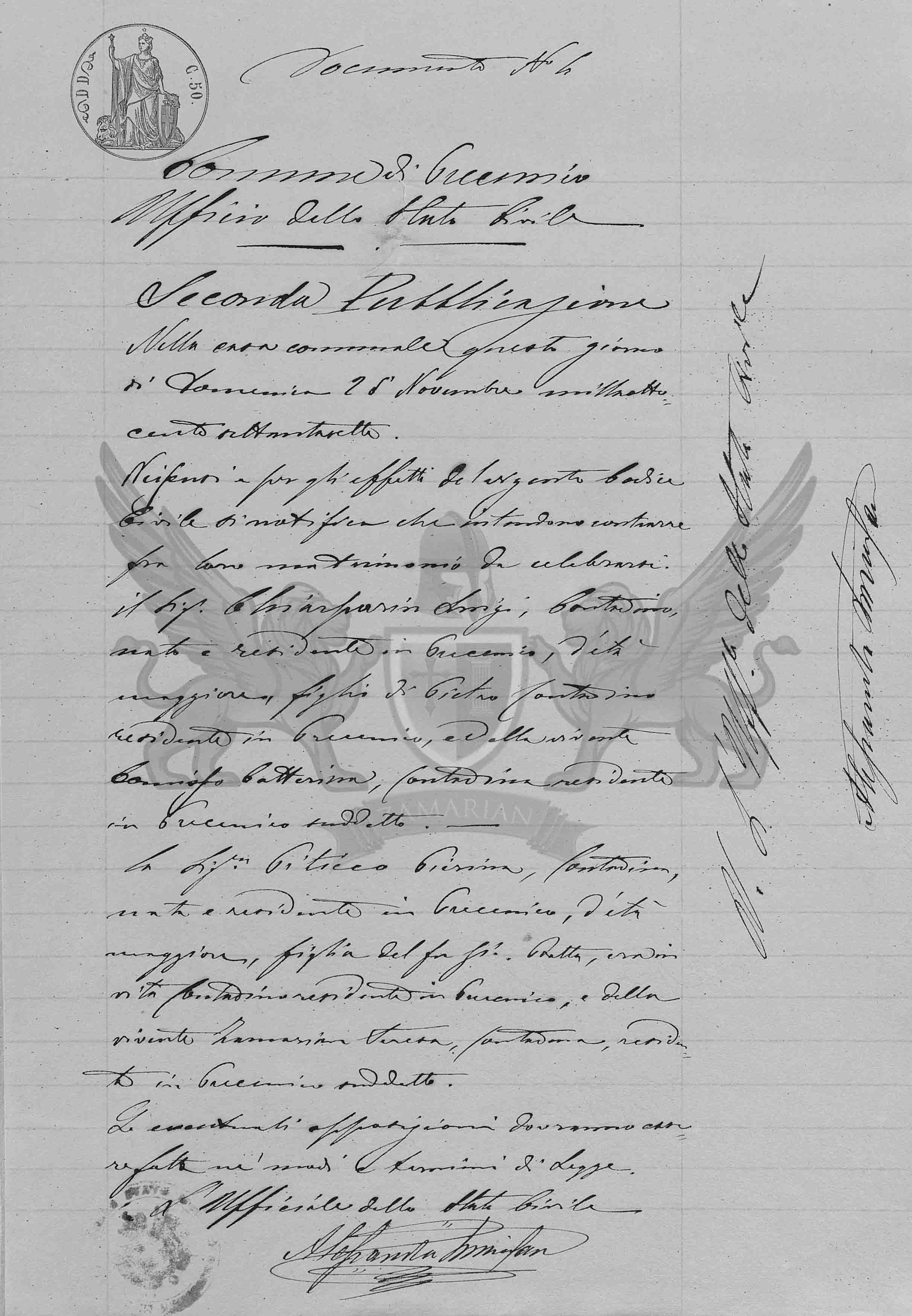 O Senhor Chiarparin Luigi, camponês, nascido e residente em Precenicco, de idade maior, filho de Pietro camponês residente em Precenicco, e da vivente Comisso Cattarina, camponesa, nascida e residente em Precenicco, supracitada e a Senhora Piticco Pierina, camponesa, nascida e residente em Precenicco, de idade maior, filha do falecido Giovanni Battista, era em vida camponês residente em Precenicco, e da vivente Zamarian Teresa, camponesa residente em Precenicco supracitado.
