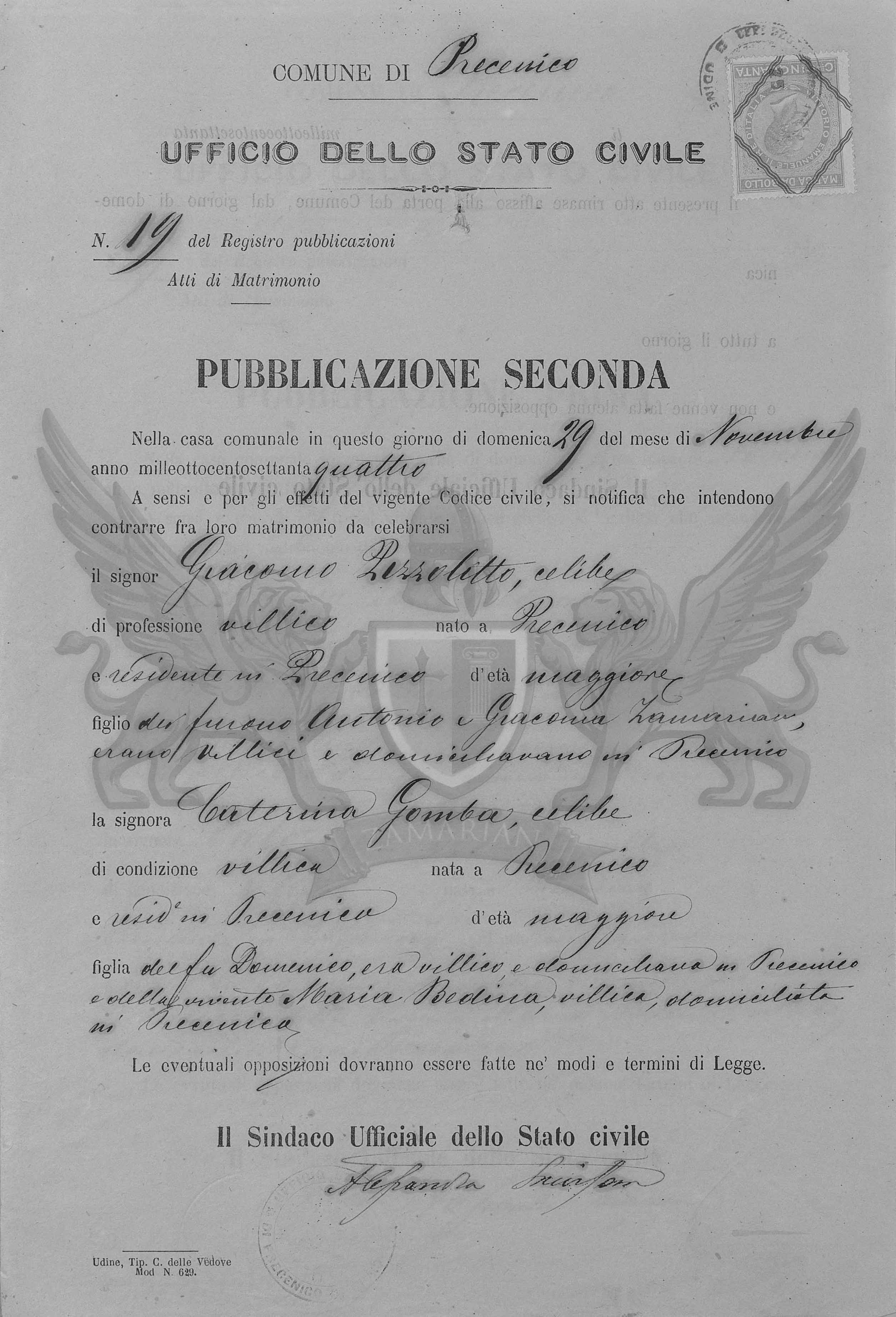 A sensos e pelos efeitos do vigente Código Civil, se notifica que ontem contrair matrimônio entre eles a celebrar neste Ofício o Senhor Giacomo Pizzolitto, solteiro, de profissão camponês nascido em Precenicco e residente em Precenicco, de idade maior, filho dos falecidos Antonio e Giacoma Zamarian, eram camponeses e domiciliavam em Precenicco e a Senhora Caterina Gomba, solteira de condição camponesa, nascida em Precenicco e residente em Precenicco, de idade maior, filha do finado Domenico era camponês e domiciliava em Precenicco, e da vivente Maria Bedina, camponesa domiciliada em Precenicco.