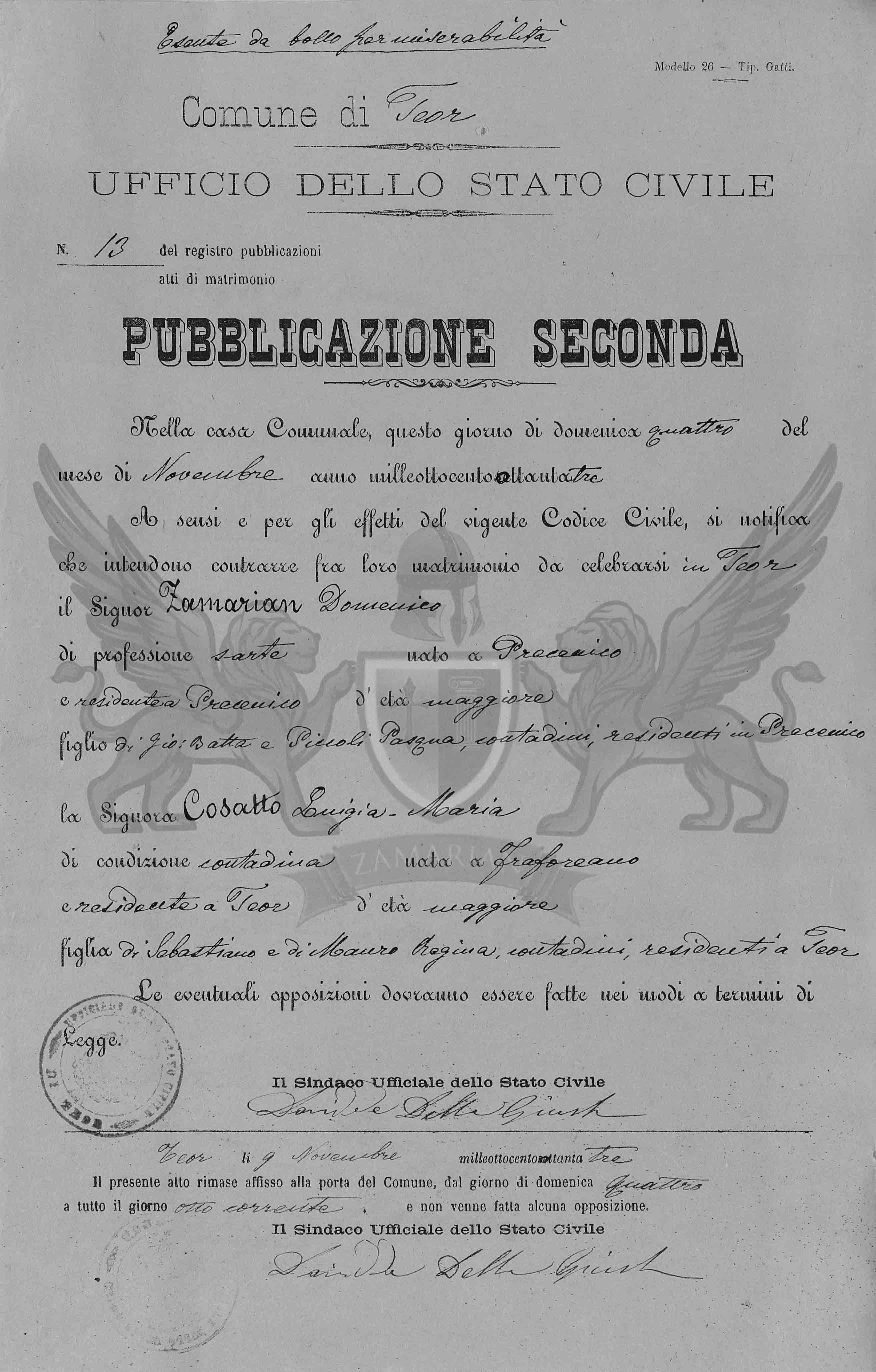A sensos e pelos efeitos do vigente Código Civil, se notifica que intendem contrair entre eles matrimônio a celebrar-se em Teor o Senhor Zamarian Domenico de profissão sarte nascido em Precenicco de idade maior filho de Giovanni Battista e Piccoli Pasqua, camponeses, residentes em Precenicco e a Senhora Cosatto Luigia Maria de condição camponesa nascida em Fraforeano e residente em Teor de idade maior filha de Sebastiano e de Mauro Regina, camponeses, residentes em Teor.