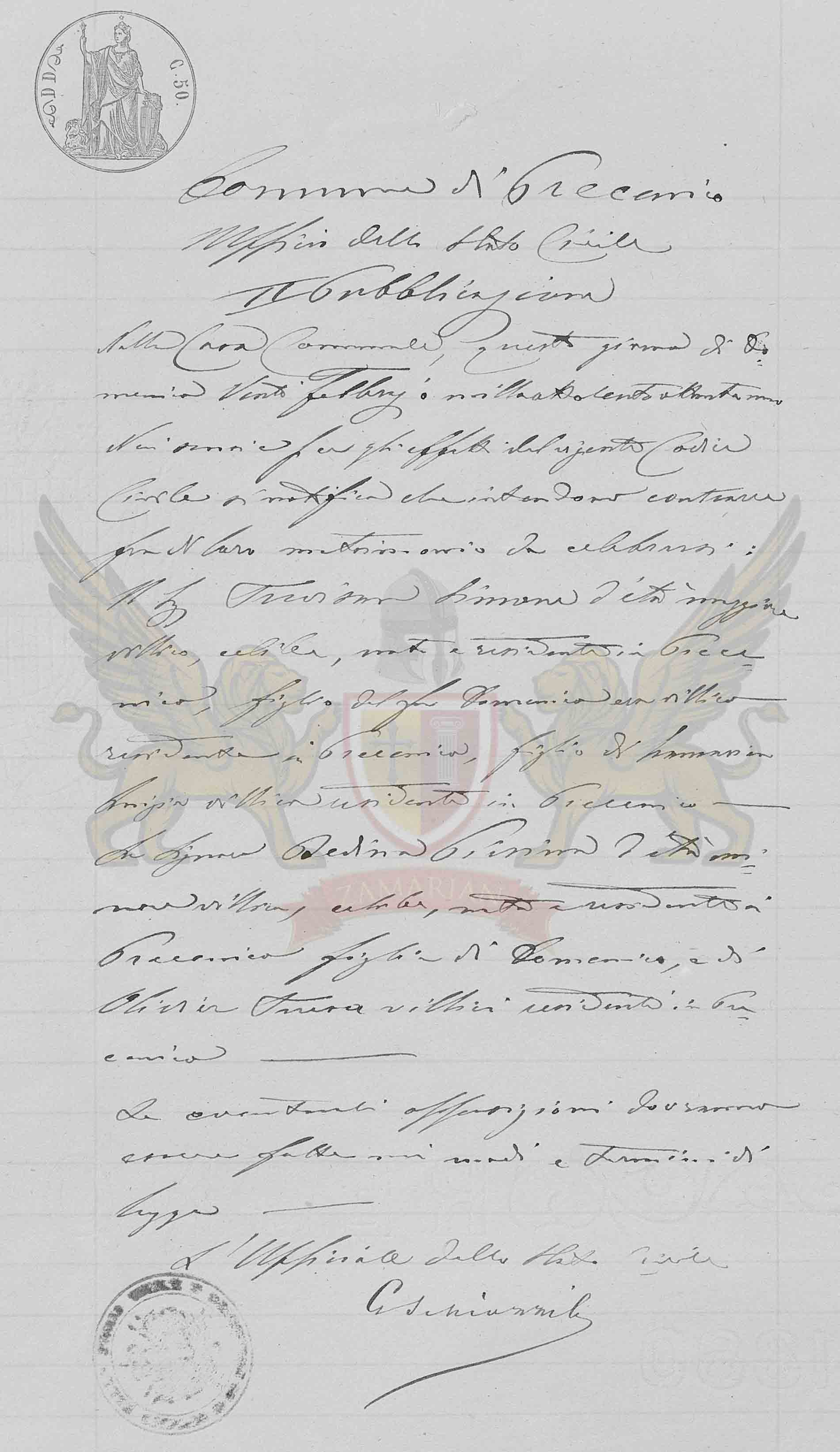 O Senhor Trevisan Simone de idade maior camponês, solteiro, nascido e residente em Precenicco, filho do falecido Domenico era camponês residente em vida em Precenicco, e de Zamarian Luigia camponês residente em Precenicco;