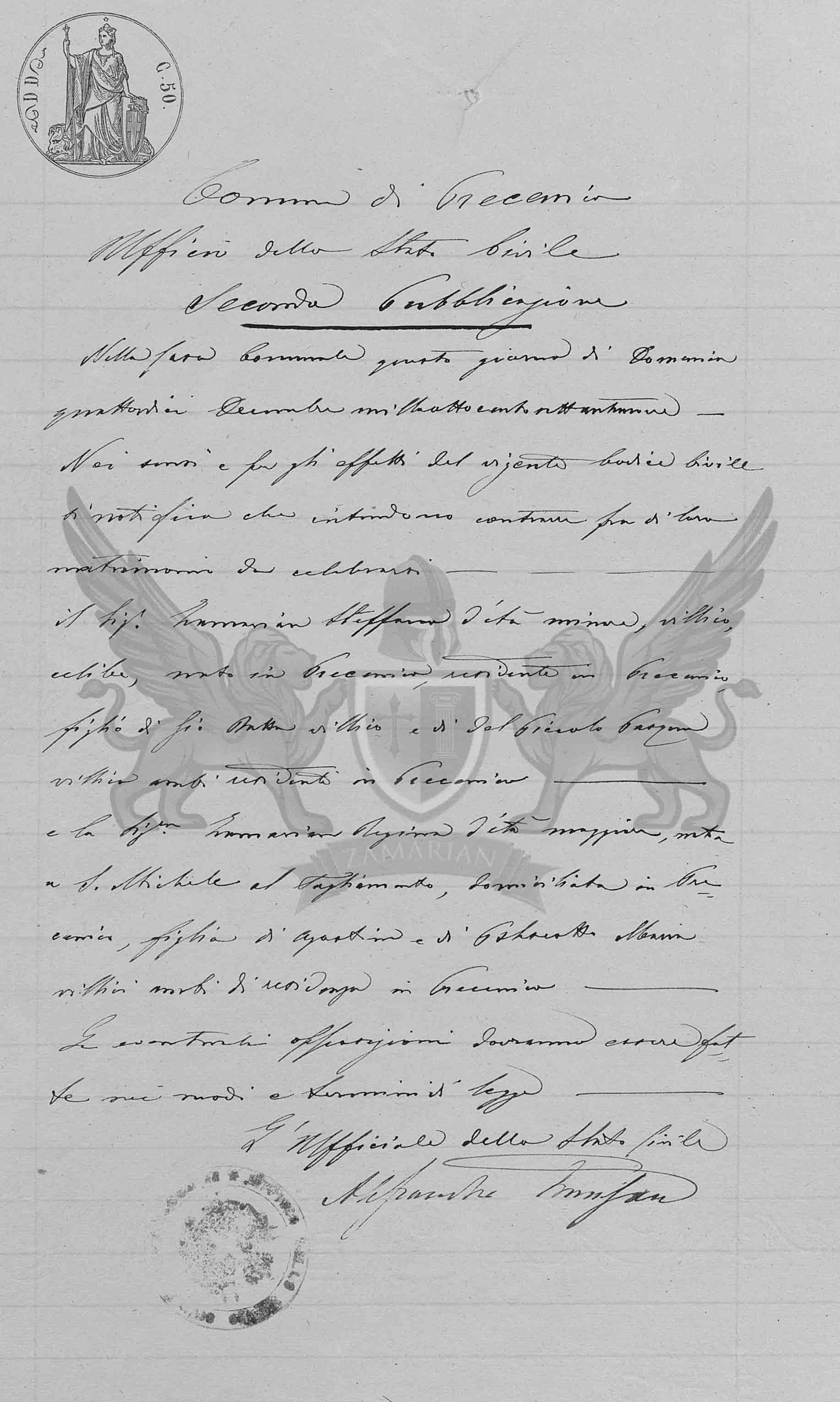 O Senhor Zamarian Stefano de idade menor camponês, solteiro, nascido em Precenicco, residente em Precenicco, filho de Giovanni Battista camponês e de Del Picoli Pasqua camponesa residente em Precenicco.