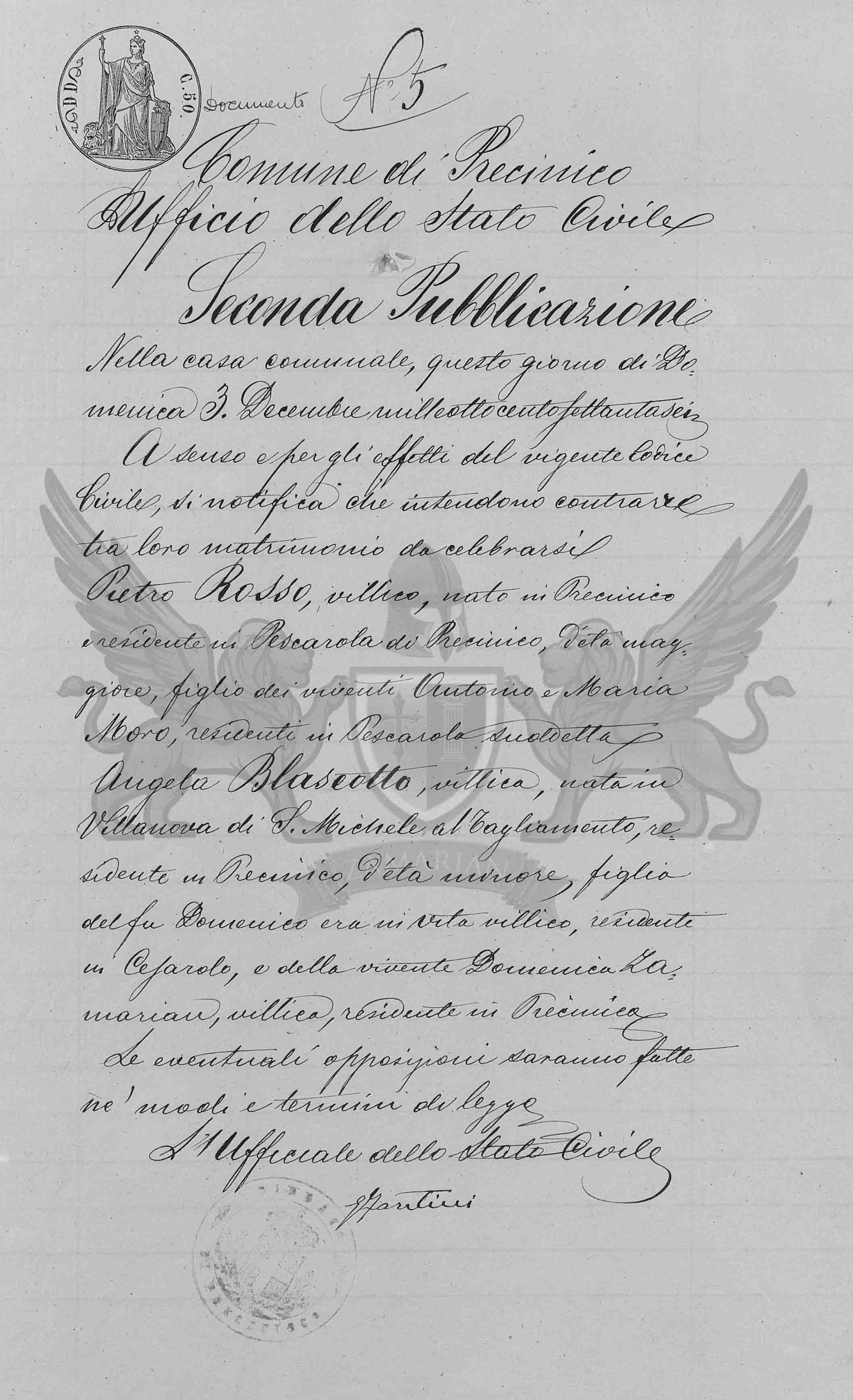 A sensos e pelos efeitos do vigente Código Civil se notifica que intendem contrair matrimônio Pietro Rosso, camponês nascido em Precenicco residente em Pescarola de Precenicco, de idade maior, filho dos viventes Antonio e Maria Moro, camponeses, residentes em Pescarola supracitada.