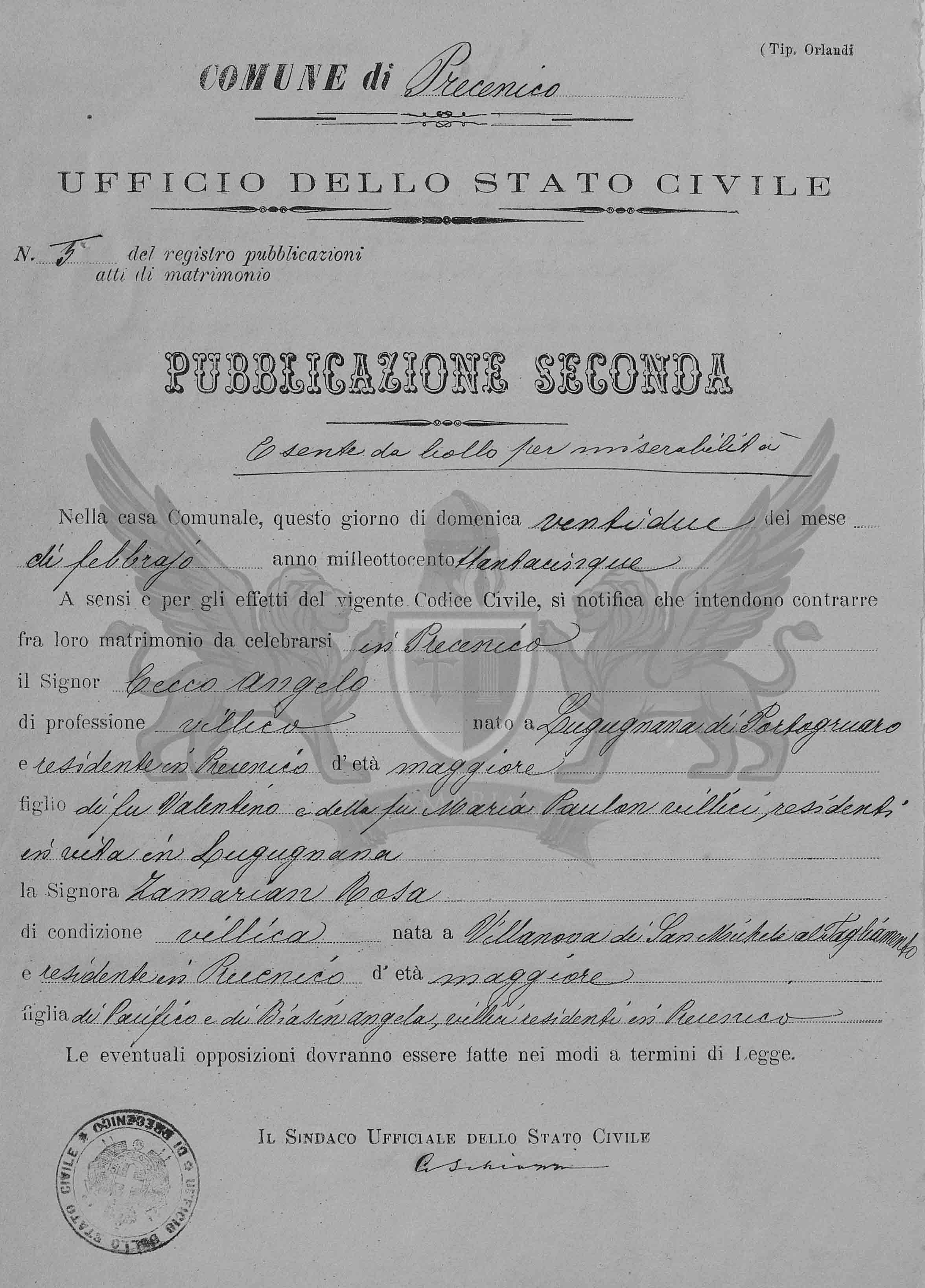 A sensos e pelos efeitos do vigente Código Civil, notifica-se que intentem contrair entre eles matrimônio a celebrar-se em Precenicco o Senhor Cecco Angelo de profissão camponês, nascido em Lugugnana de Portogruaro e residente em Precenicco de idade maior, filho do falecido Valentino e da falecida Maria Paulon, camponeses, residentes na dita Lugugnana e a senhora Zamarian Rosa de condição camponesa, nascida em Villanova de San Michele al Tagliamento e residente em Precenicco, de idade maior, filha de Pacifico e de Biasin Angela, camponeses, residentes em Precenicco.