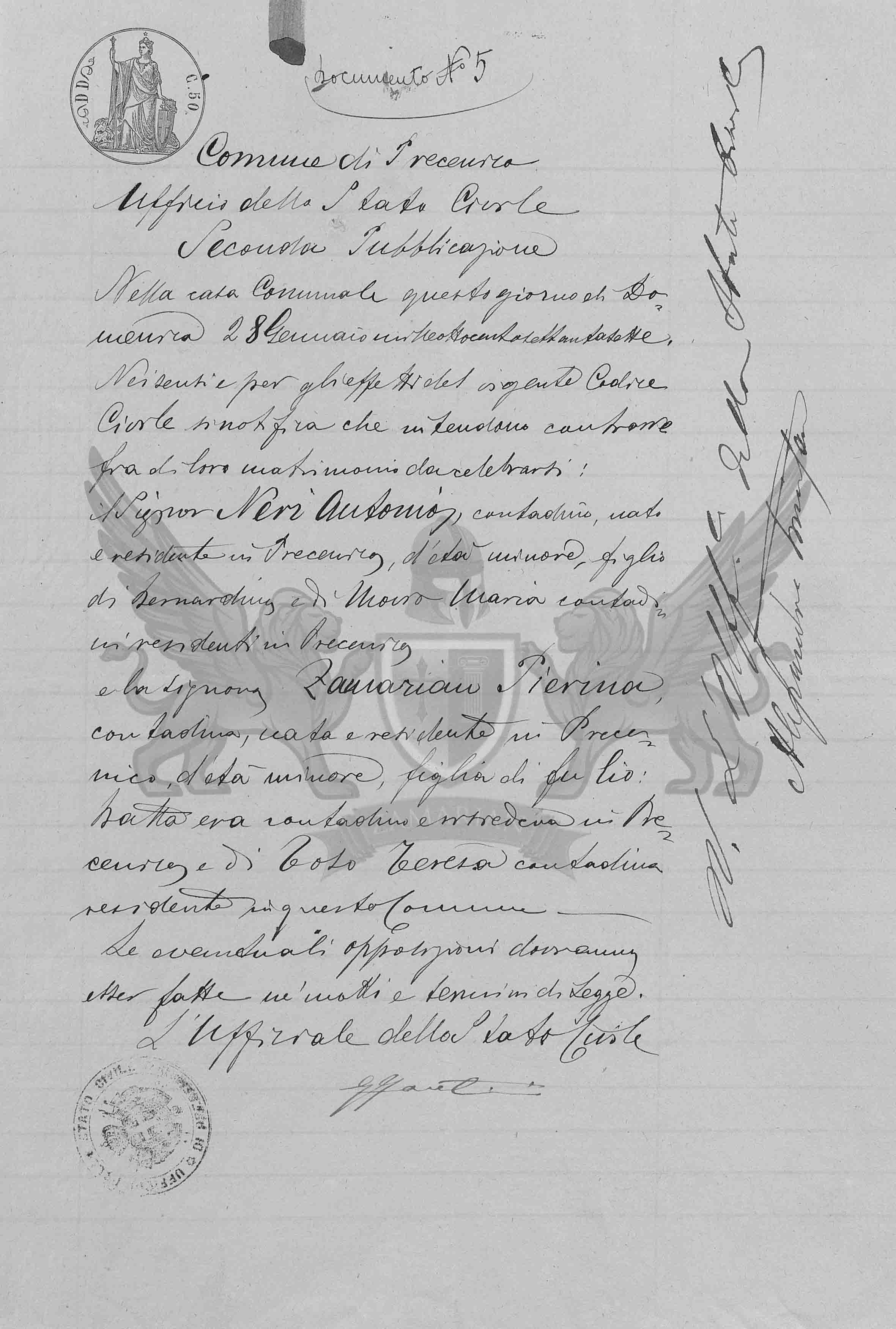 O Senhor Neri Antonio, camponês, nascido e residente em Precenicco, de idade menor, filho de Bernardino e de Movio Maria camponeses residentes em Precenicco e a Senhora Zamarian Pierina, camponesa, nascida e residente em Precenicco, de idade menor, filha do falecido Giovanni Battista era camponês e residia em Precenicco e de Toso Teresa camponesa residente neste Município.