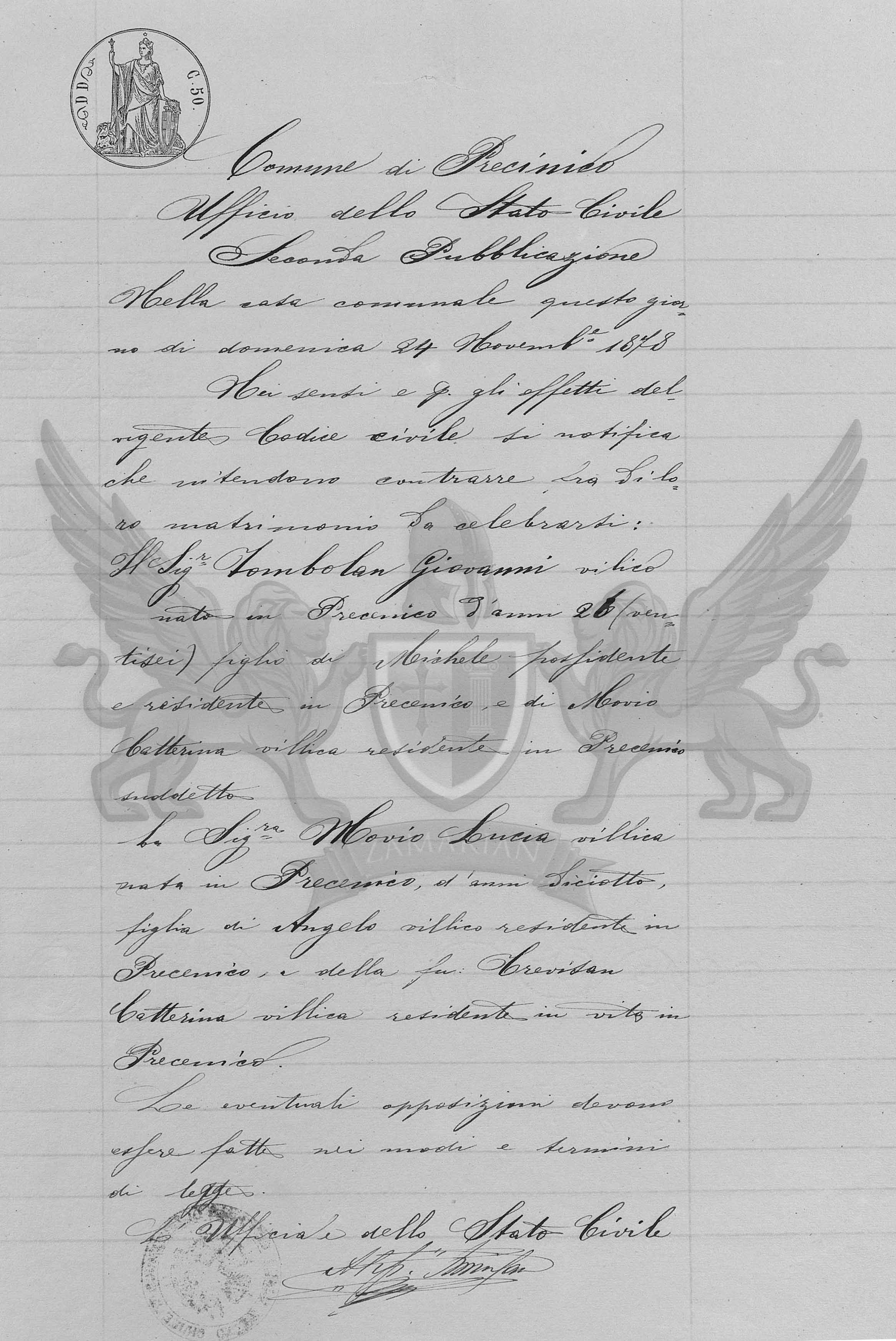 O Senhor Tombolan Giovanni, camponês, nascido em Precenicco, de vinte e seis anos, filho de Michele, proprietário e residente em Precenicco, e de Mauro Catterina, camponesa, residente em Precenicco supracitada.