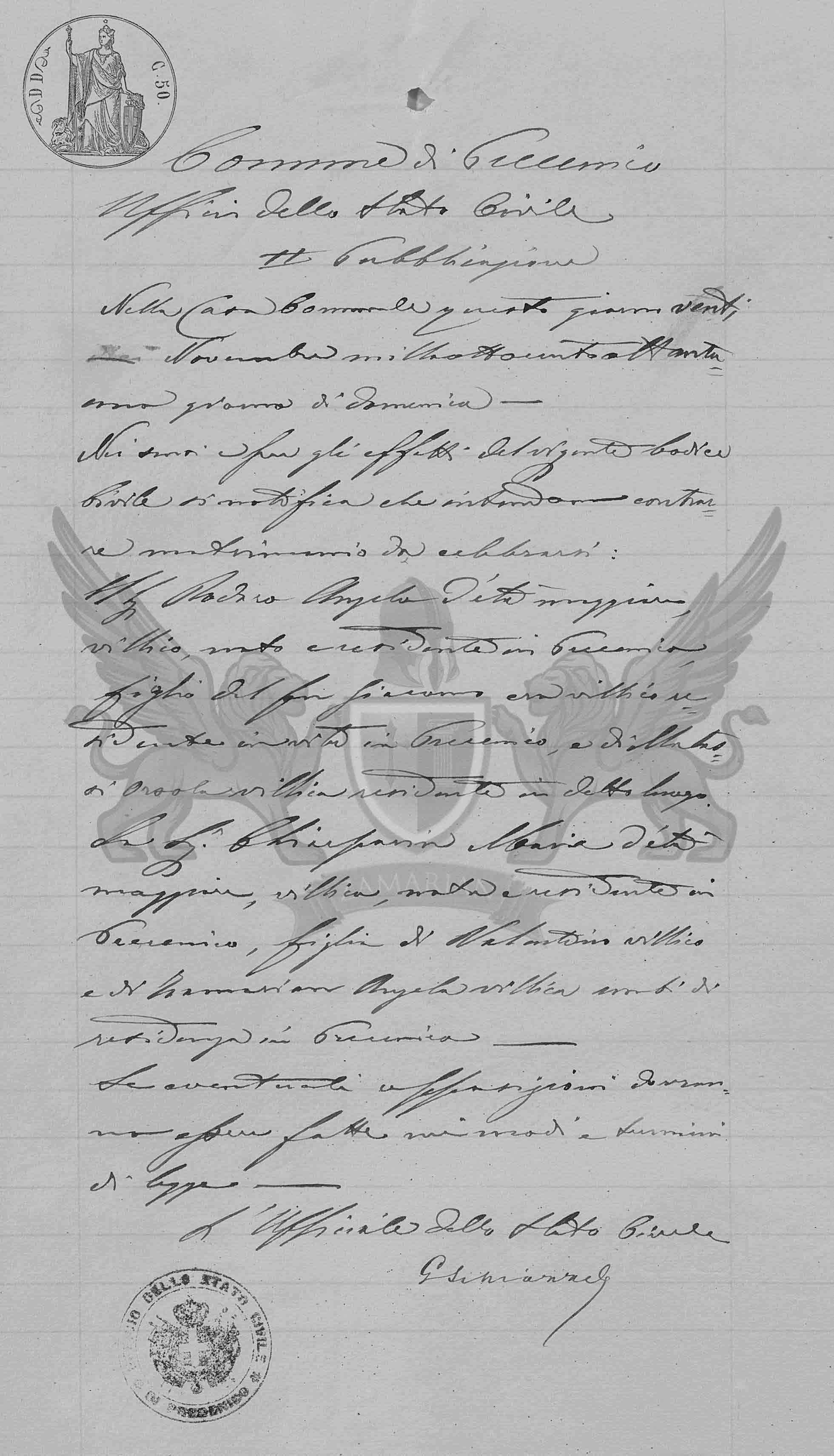 e a Senhora Chiarparin Maria de idade maior, camponesa, residente e nascida em Precenicco, filha de Valentino camponês e de Zamarian Angela camponesa, ambos de Precenicco.