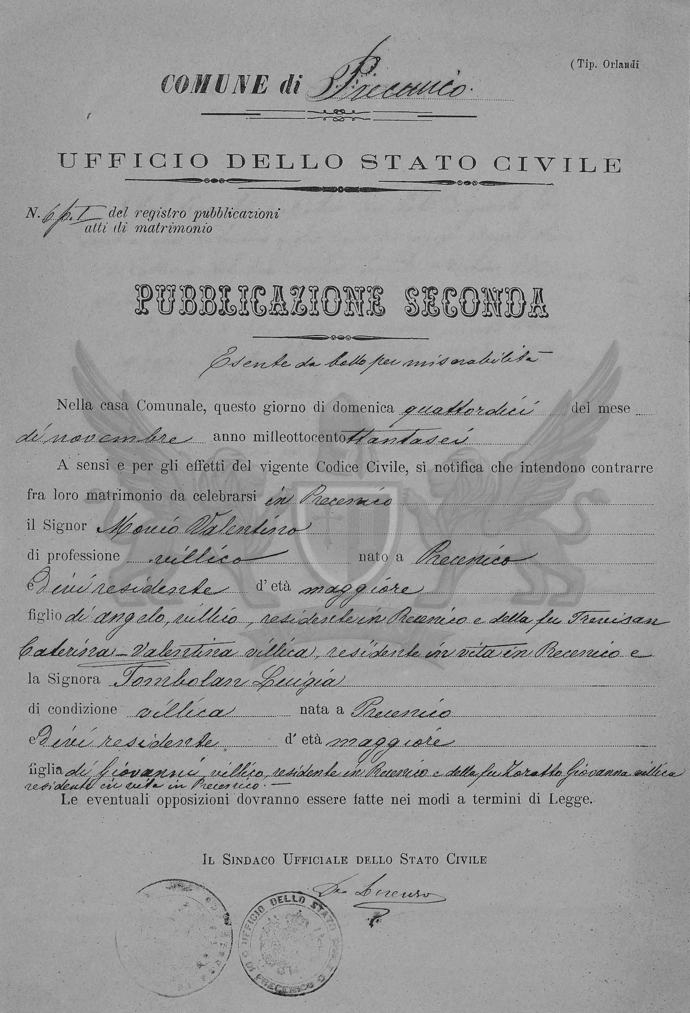 Aos sensos e para os efeitos do vigente Código Civil, se notifica que intendem contrair entre eles matrimônio a celebrar-se em Precenicco o Senhor Movio Valentino, de profissão camponês, nascido em Precenicco onde é residente, de idade maior, filho de Angelo, camponês, residente em Precenicco e de Trevisan Catarina-Valentina, camponesa, residente em vida em Precenicco e da Senhora Tombolan Luigia, de condição camponesa, nascida em Precenicco, de idade maior, filha de Giovanni, camponês, residente em Precenicco e da falecida Zoratto Giovanna, camponesa, residente em vida em Precenicco.