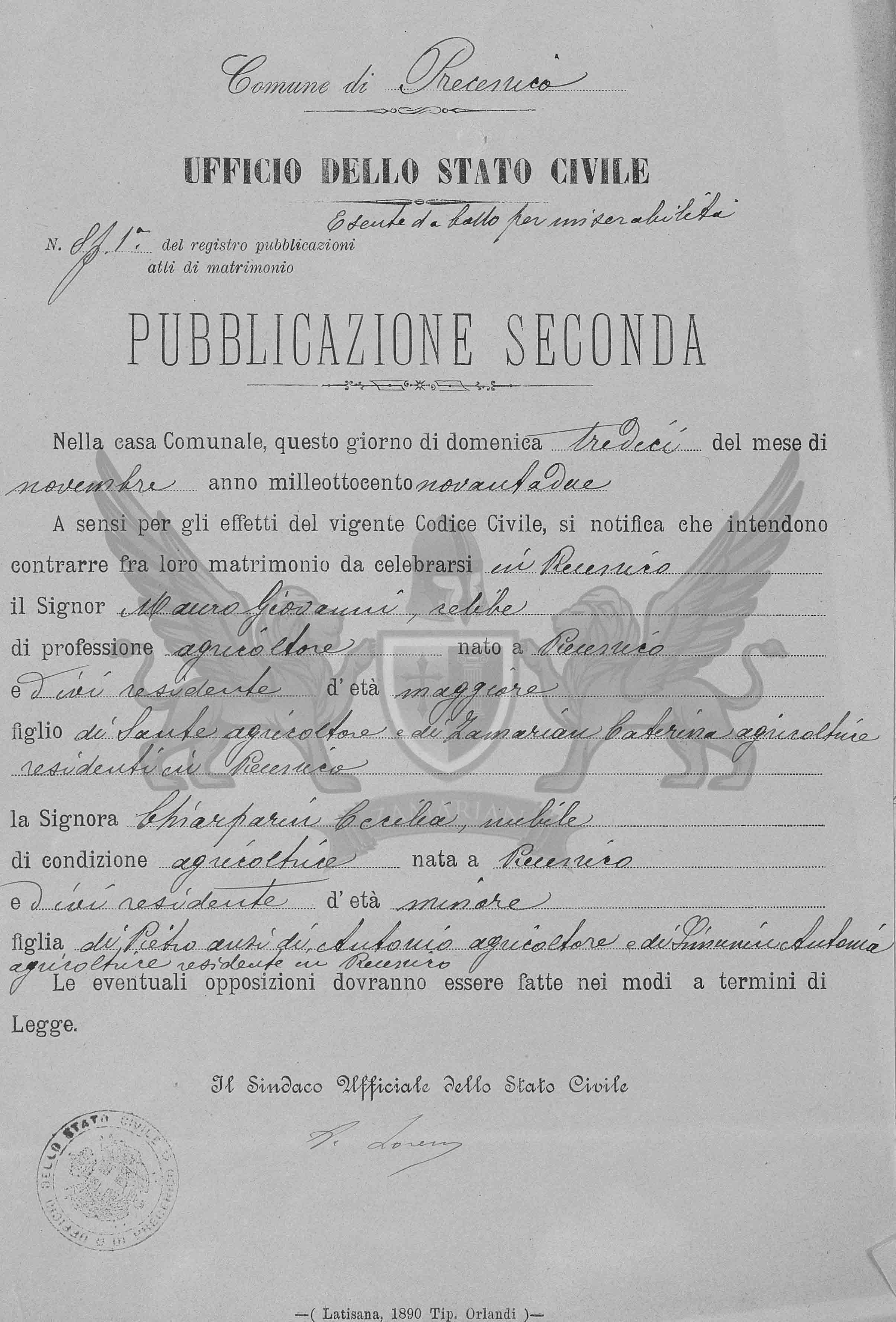 A sensos e para os efeitos do vigente Código Civil, se notifica que intendem contrair entre eles matrimônio a celebrar-se em Precenicco, o Senhor Mauro Giovanni, solteiro, de profissão agricultor, nascido em Precenicco, onde é residente, de idade maior, filho de Sante, agricultor e de Zamarian Caterina, agricultora, residentes em Precenicco, e a Senhora Chiarparin Cecilia, solteira de condição agricultora, nascida em Precenicco e onde é residente, de idade menor, filha de Antonio, agricultor e de Simonin Antonia, agricultora, residentes em Precenicco.