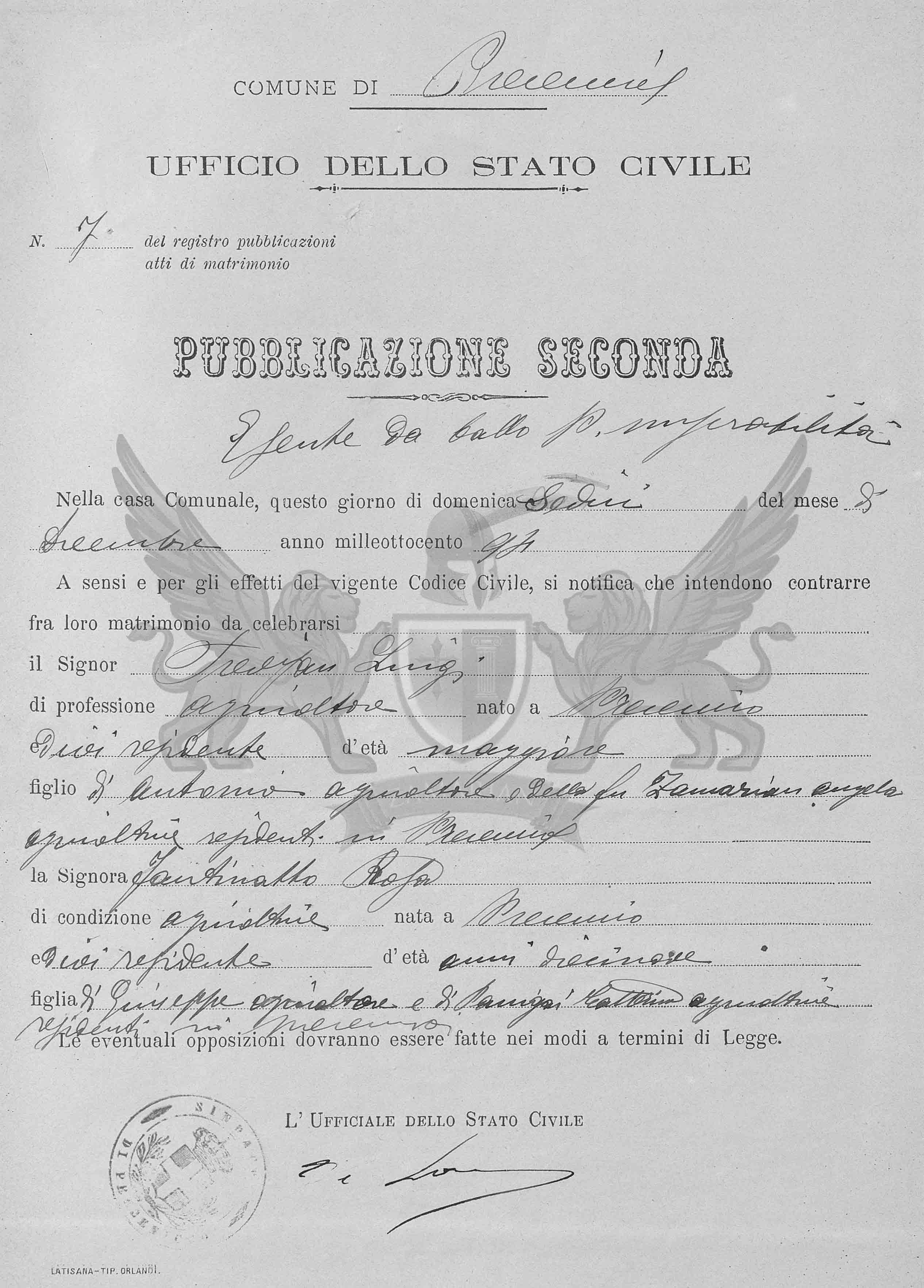 A sensos e para os efeitos do vigente Código Civil, se notifica que intendem contrair entre eles matrimônio a celebrar-se em Precenicco, o Senhor Trevisan luigi, de profissão agricultor, nascido em Precenicco, onde é residente, de idade maior, filho de Antonio, agricultor e da falecida Zamarian Angela, agricultora, residentes em Precenicco, e a Senhora Zamarian Angela de condição agricultora, nascida em Precenicco e onde é residente, de idade dezenove anos, filha de Giuseppe agricultor e de Panigai Catterina agricultora, residentes em Precenicco.