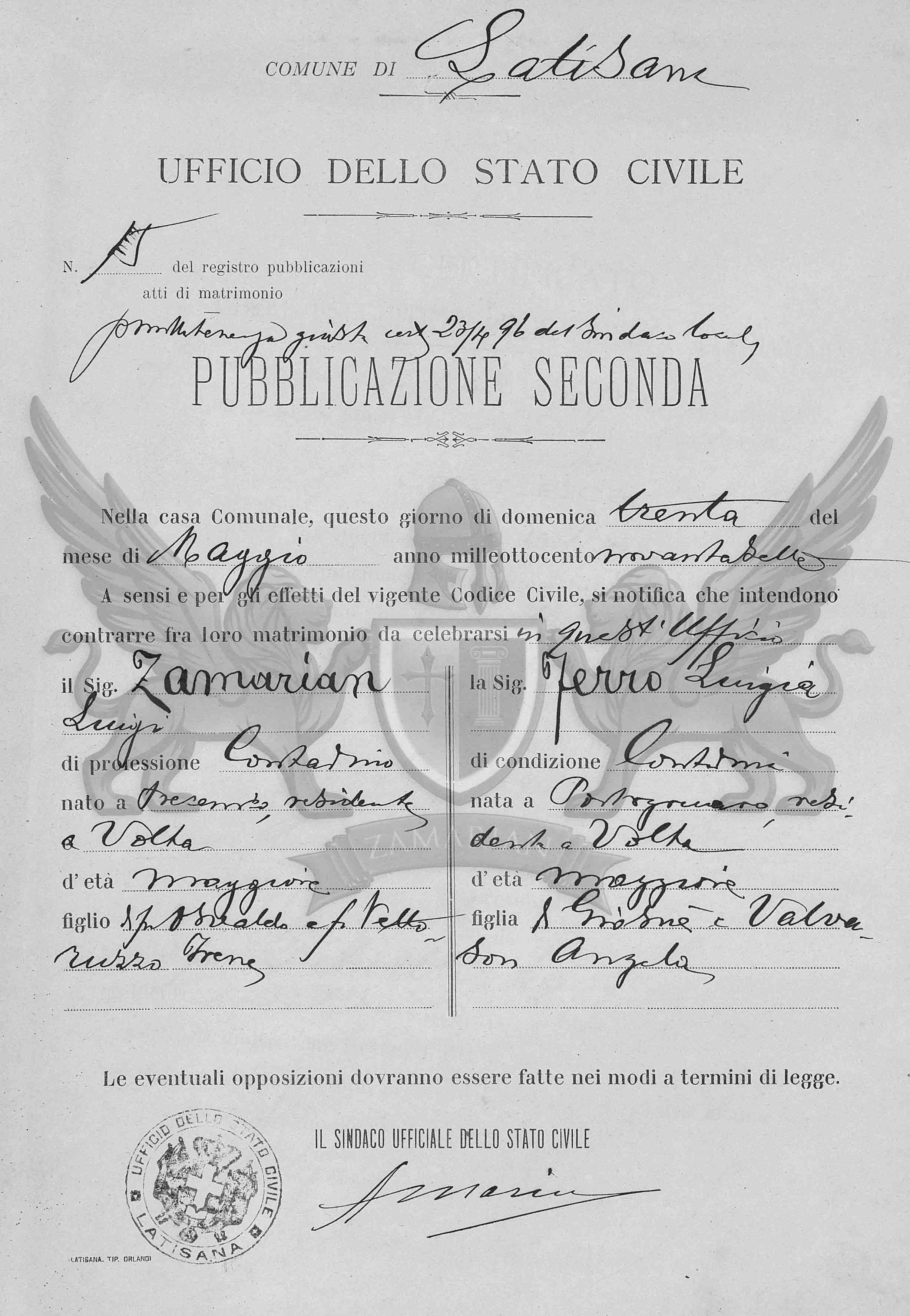A sensos e pelos efeitos do vigente Código Civil, se notifica que ontem contrair matrimônio entre eles a celebrar neste Ofício o Senhor Zamarian Luigi de profissão camponês nascido em Precenicco, residente em Volta daqui de idade maior filho de Osvaldo e da finada Vettoruzzo Angela e a Senhora Ferro Luigia de condição camponesa, nascida em Portogruaro, residente em Volta, de idade maior, filha de Giosuè e de Valvason Angela.