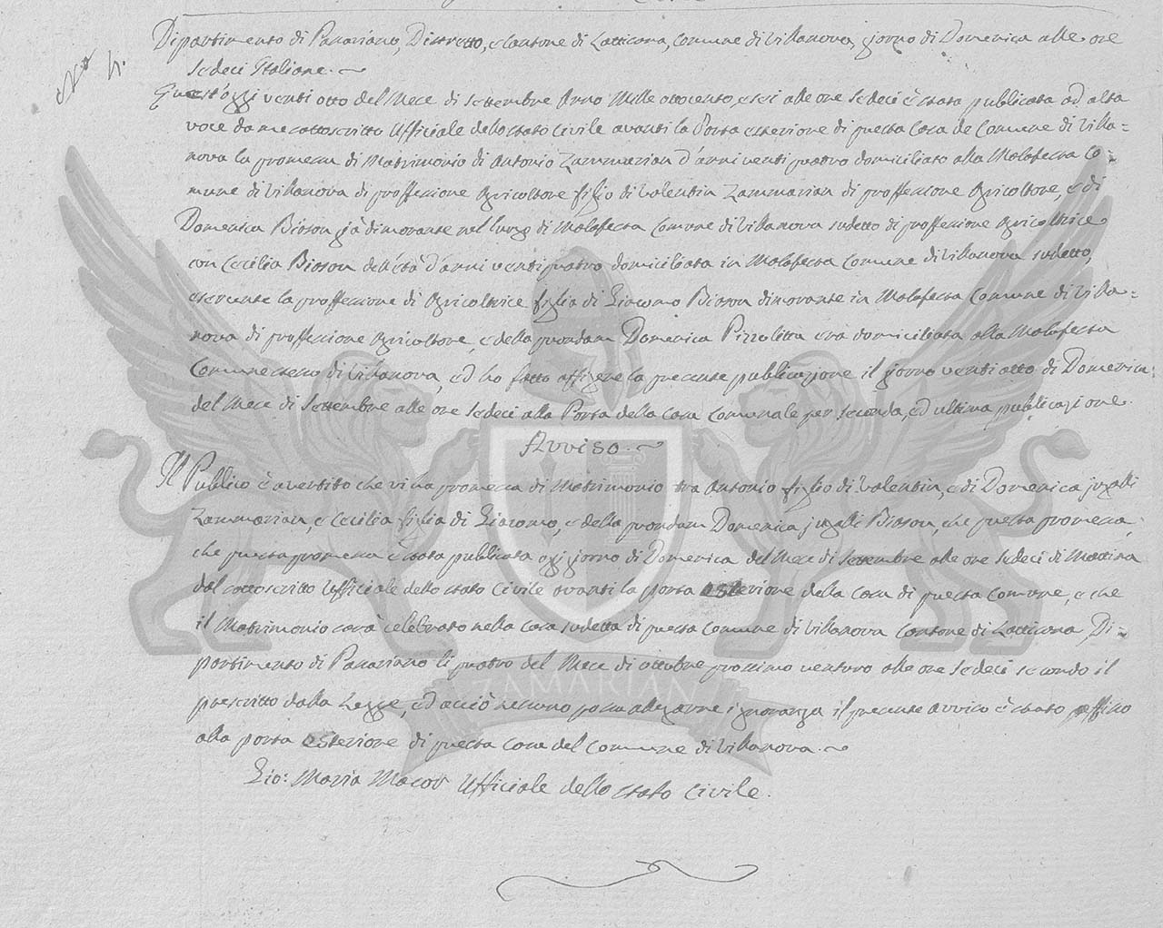 O público foi advertido que a promessa de Matrimônio entre Antonio filho de Valentin e de Domenica também Zammarian, e Cecilia filha de Giacomo, e da finada Domenica da mesma forma Biason, que esta promessa foi publicada hoje dia de Domingo mês de Setembro às dez horas da manhã do subscrito Oficial do Registro Civil diante da porta da casa deste Município, e que o matrimônio será celebrado na casa deste município de Villanova, Cantão, e Distrito de Latisana, Departamento de Passariano no mês de outubro próximo vinte e um às dezesseis horas, segundo o prescrito na Lati, e a isto ninguém possa alegar ignorância o presente aviso foi fixado no exterior dessa casa do Município de Villanova.