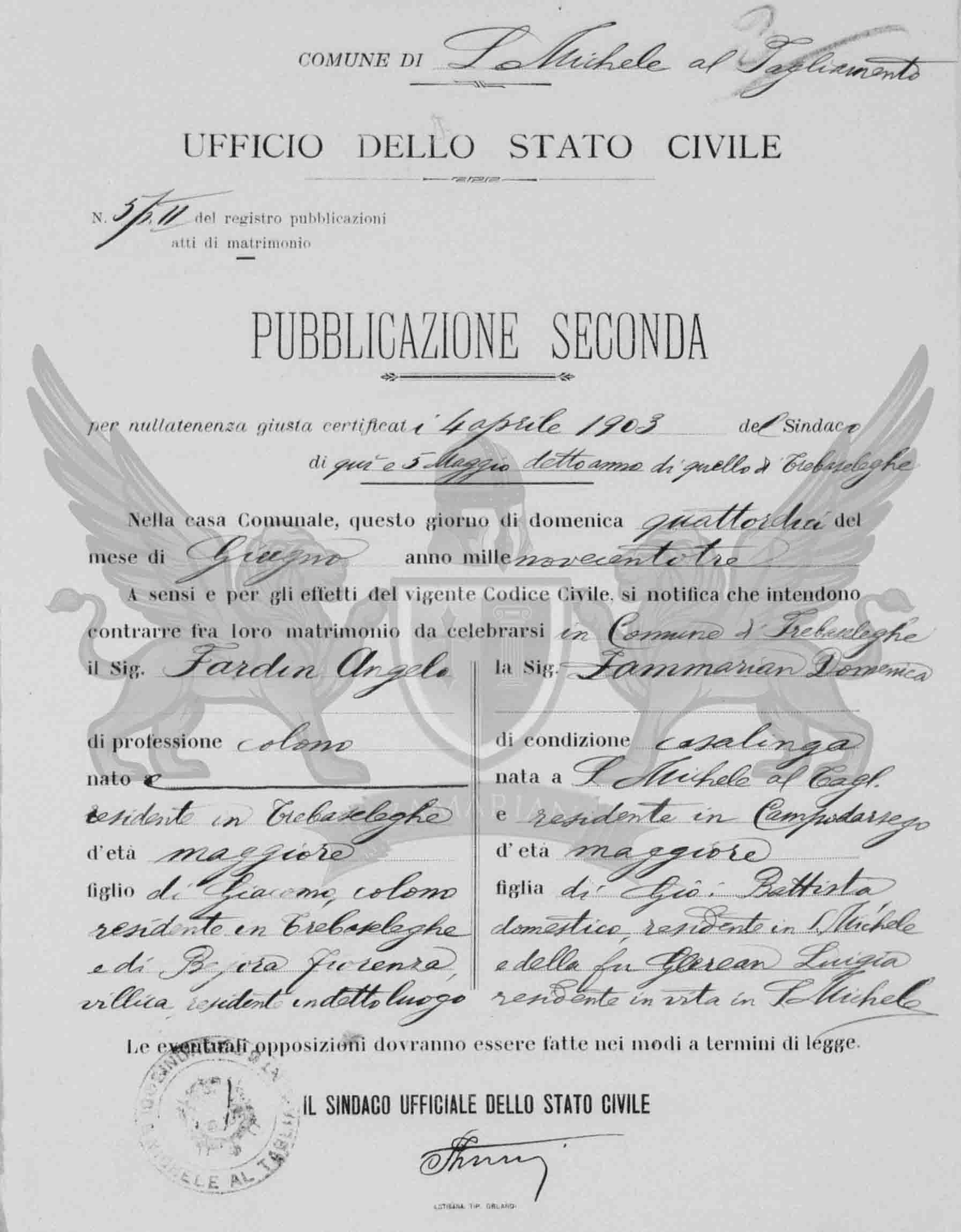 A sensos e pelos efeitos do vigente Código Civil, se notifica que intendem contrair matrimônio entre eles a celebrar neste no município de Trebaseleghe o Senhor Fardin Angelo de profissão colono nascido e residente em Trebaseleghe, de idade maior, filho de Giacomo, colono, residente em Trebaseleghe e de Rejora Fiorenza, camponesa, residente no local referido e a Senhora Zamarian Domenica de condição dona de casa, nascida em San Michele al Tagliamento, residente em Campodarsego, de idade maior, filha de Giovanni Battista, doméstico, residente em San Michele e da falecida Glerean Luigia, residente em vida em San Michele.