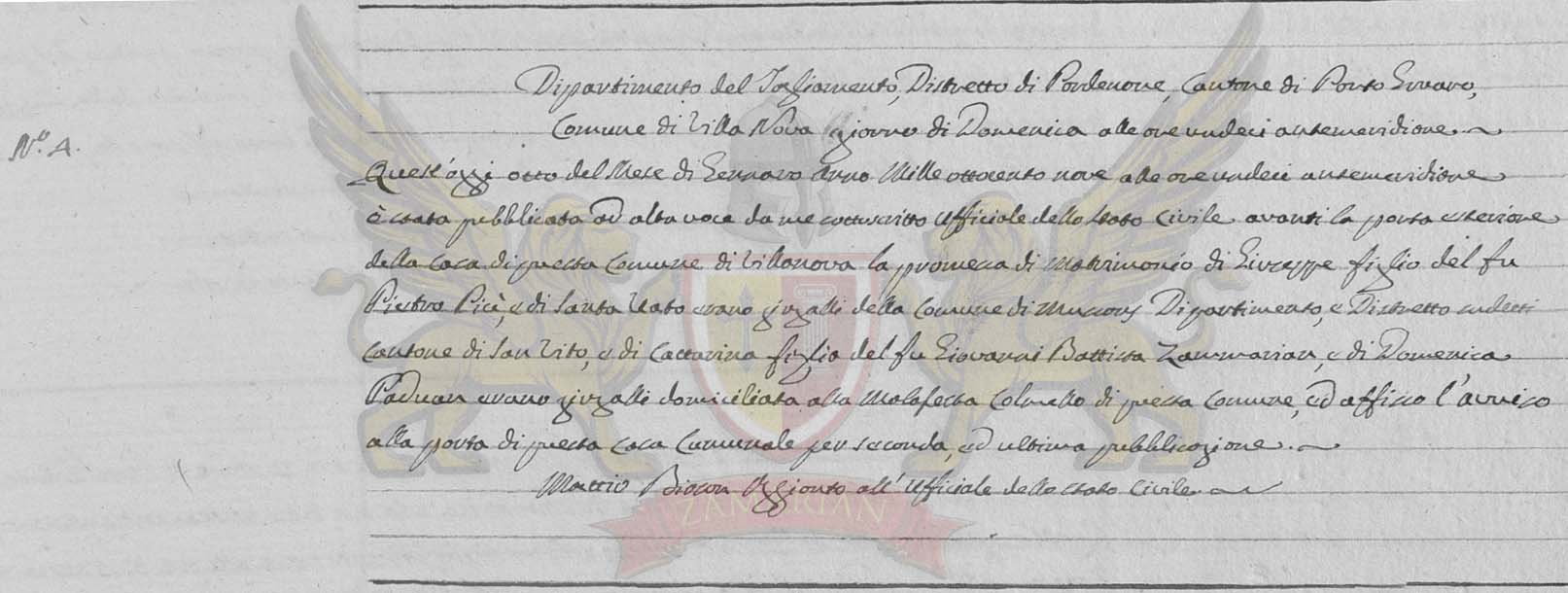 Este dia de hoje oito de Janeiro, ano mil oitocentos e nove às onze horas da manhã foi publicada em alta voz por mim subscrito Oficial do Registro Civil diante da porta exterior da Casa deste Município de Villanova a promessa de matrimônio de Giuseppe filho do finado Pietro Picè e de Santa Uato eram da mesma forma do Município de Mussons Departamento, e Distrito supra citados Cantão de San Vito, e de Cattarina filha do finado Giovanni Battista Zammarian, e de Domenica Paduan da mesma forma domiciliados em Malafesta distrito desse Município, e fixei o aviso na porta desta casa Municipal por segunda, e última publicação.