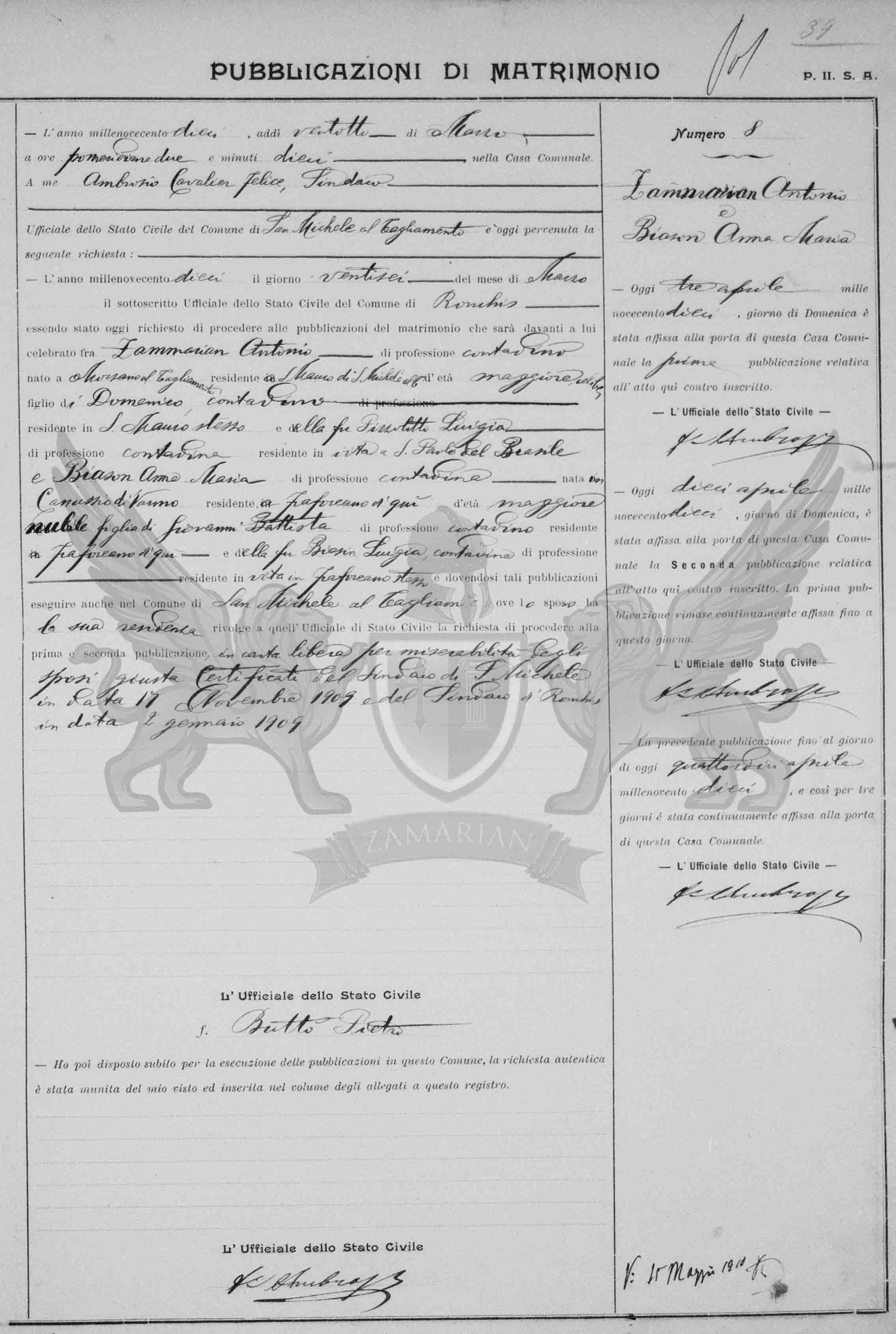 Diante de mim Ambrosio Cavalier Felice, Síndico, Oficial do Estado Civil de San Michele al Tagliamento, compareceram Zammarian Antonio, de profissão *lavrador, nascido em Morsano al Tagliamento, residente em San Mauro de San Michele al Tagliamento, de maioridade, filho de Domenico, lavrador residente na mesma San Mauro, e da falecida Pizzolitto Luigia, de profissão lavradora, residente em vida em São Paulo, Brasil; e Biason Anna Maria, de profissão lavradora, nascida em Canussio de Varmo, residente em Fraforeano daqui, de maioridade, solteira, filha de Giovanni Battista, de profissão lavrador, residente em Fraforeano daqui, e da falecida Biasin Luigia, lavradora, residente em vida na mesma Fraforeano, e devendo-se tais publicações exibir-se também em San Michele al Tagliamento onde o esposo possui sua residência resolve àquele Oficial de Estado Civil de procedere o requerimento à primeira e segunda publicação sobre papel livre pela miserabilidade dos esposos junto aos Certificados do Síndico de San Michele em data de 17 de novembro de 1909 e do Síndico de Ronchis em data de 2 de janeiro de 1909.