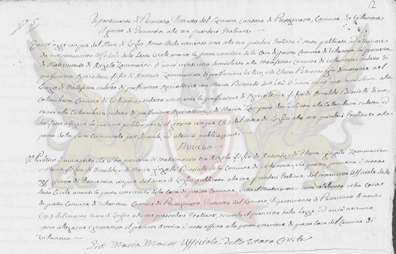 O público foi advertido que a promessa de Matrimônio entre Angelo filho de Antonio, e de Elena todos Zammarian, e Maria filha de Osvaldo, e de Maria todos Biasiolli do Município de Villanova, que esta promessa foi publicada hoje dia de Domingo vinte e oito mês de Junho às quinze horas Italianas pelo subscrito Oficial do Registro Civil diante à porta exterior da casa deste Município, e que o matrimônio será celebrado na Casa deste município de Villanova, Cantão de Portogruaro, Distrito de Lemene, Departamento de Passariano dia nove (9) do mês de Julho próximo às quatorze horas italianas, segundo o prescrito da Lei, e a isto ninguém possa alegar ignorância o presente aviso foi fixado à porta exterior desta casa do Município de Villanova.