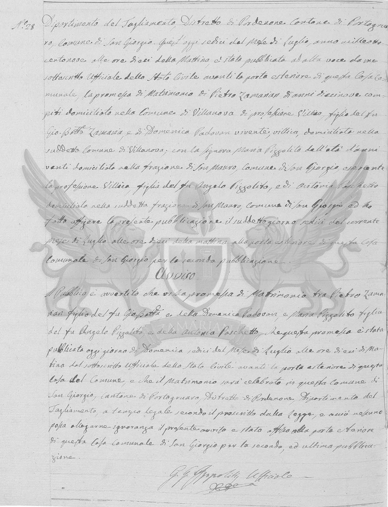 Departamento do Tagliamento, Distrito de Pordenone e Cantão de Portogruaro, Município de San Giorgio, neste dia dezesseis do mês de julho, do ano mil oitocentos e nove às dez hora da manhã foi publicada em alta voz por mim subscrito oficial do Registro Civil diante da porta exterior desta casa comunal a promessa de matrimônio de Pietro Zamarian de dezenove anos, completos domiciliado no Município de Villanova, de profissão camponês filho do finado Gio Batta Zamarian, e de Domenica Padovan, vivente de profissão camponesa residente no supracitado Município de Villanova, com a Senhora Maria Pizzolitto de vinte anos de idade domiciliada na fração de San Mauro, Município de San Giorgio; e afixei a presente publicação no referido dia nove do mês de julho, às dez horas da manhã à porta exterior desta casa municipal de San Giorgio como segunda publicação.
