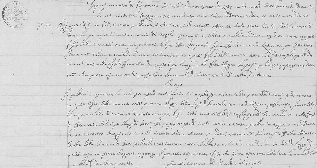 Departamento de Passariano, Distrito de Udine, Cantão de Latisana, Município de Teor, dia de Domingo -23- de maio de -1813- mil oitocentos e treze às -11- onze hora da manhã. Hoje dia e hora supracitados fora publicada em alta voz pelo subscrito oficial do Registro Civil do Município de Teor a promessa de matrimônio de Angelo Zamarian camponês, e solteiro de -19- dezenove anos completos filho dos viventes Antonio, e Maria Filippo da Fração de Pescarola Município de Latiasana, com Francesca Simonat camponesa, e solteira de de -18- dezoito anos de idade completos filha dos viventes Antonio, e Angela Zorat domiciliados na Fração de Rivarotta desta Metrópole, e fiz afixar a citada publicação neste dia, e hora mencionada na porta exterior desta Casa Civil de Teor pela segunda e última vez.