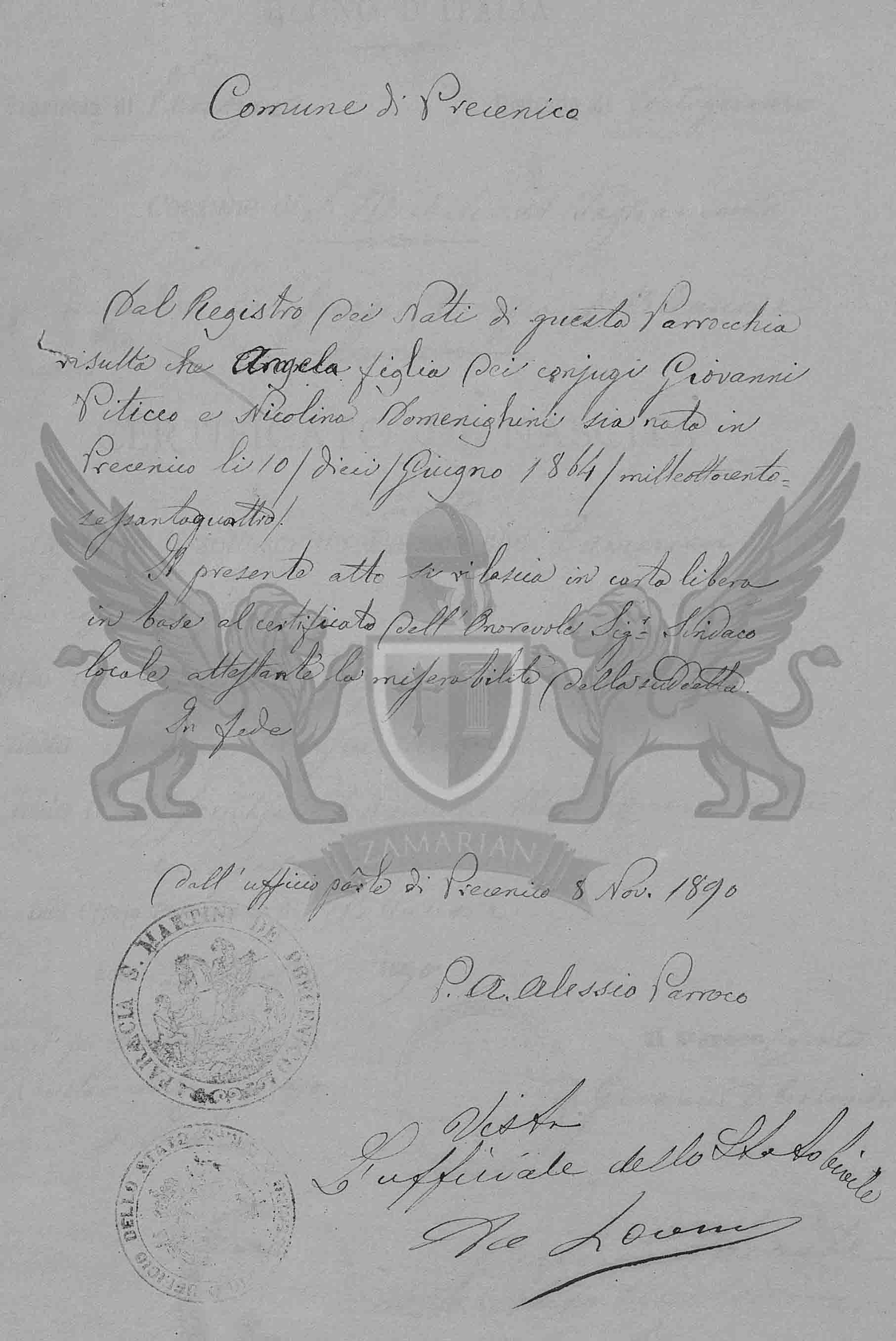 Do Registro autêntico dos Nascidos desta Paróquia resulta que Angela filha dos cônjuges Giovanni Piticco e Nicolina Domenighini seja nascida em Precenicco dia 10 /dez/ de Junho de 1864 /mil oitocentos e sessenta e quatro/.