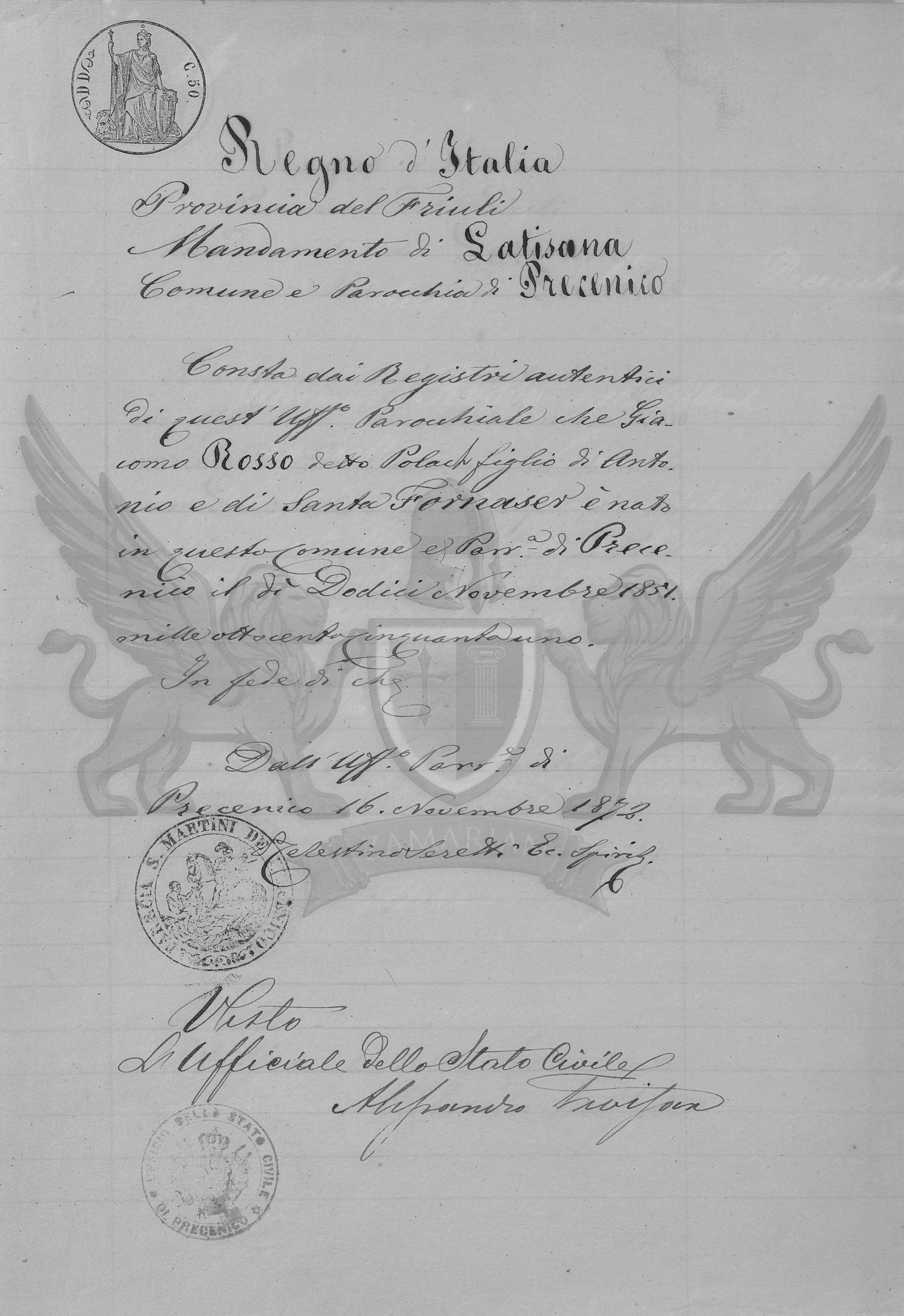 Consta dos Registros autênticos deste Ofício Paroquial que Giacomo Rosso conhecido Polach filho de Antonio e de Santa Fornasier nasceu neste Município e Paróquia de Precenicco no dia Doze de Novembro de 1851 mil oitocentos e cinquenta e um.