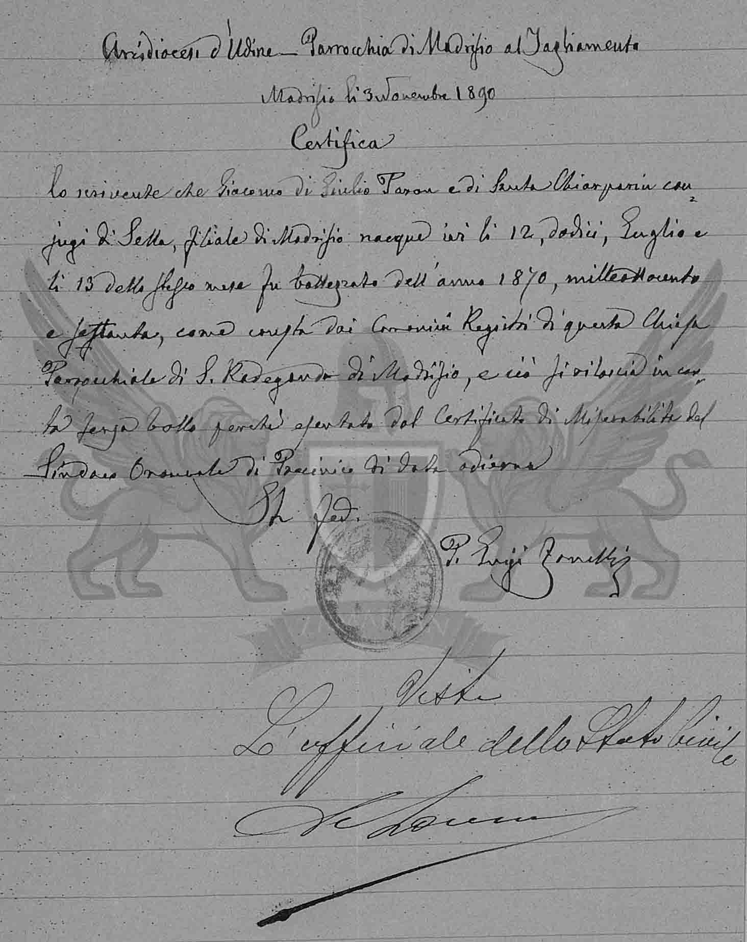 O escrevente que Giacomo filho de Giulio Paron e de Santa Chiarparin cônjuges de Sella, filial de Madrisio nasce no dia 12, doze, de Julho e 13 do mesmo mês foi batizado do ano 1870, mil oitocentos e setenta, como consta dos Canônicos Registros desta Igreja Paroquial de Santa Radagonda de Madrisio, e isto se emite em papel sem franquia pelo atestado através do Certificado de Miserabilidade do Síndico Honorável de Precenicco em data ordena.