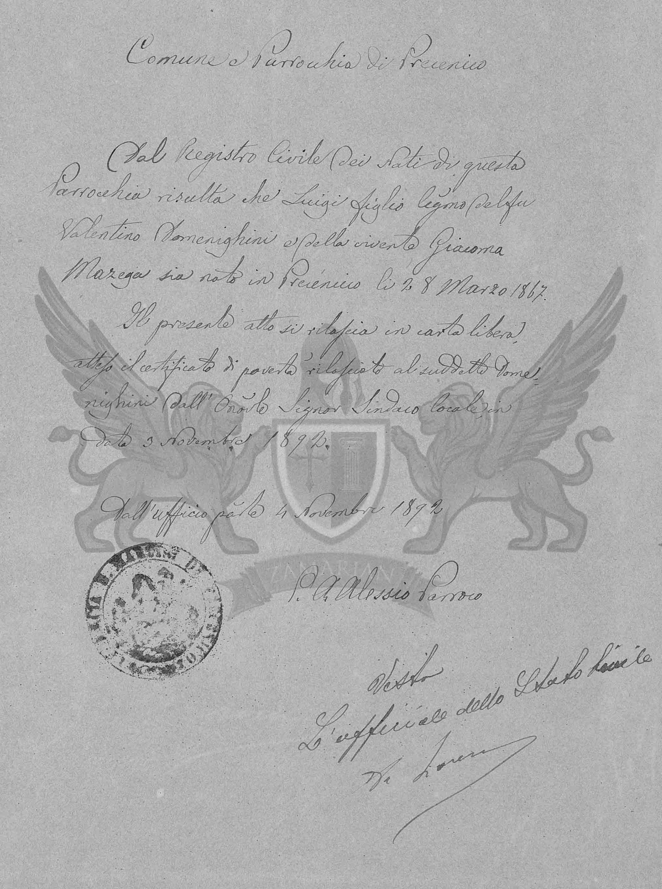 Do Registro Civil dos Nascidos desta Paróquia resulta que Luigi filho legítimo do falecido Valentino Domenighini e da vivente Giacoma Mazega seja nascido em Precenicco dia 28 de março de 1867.