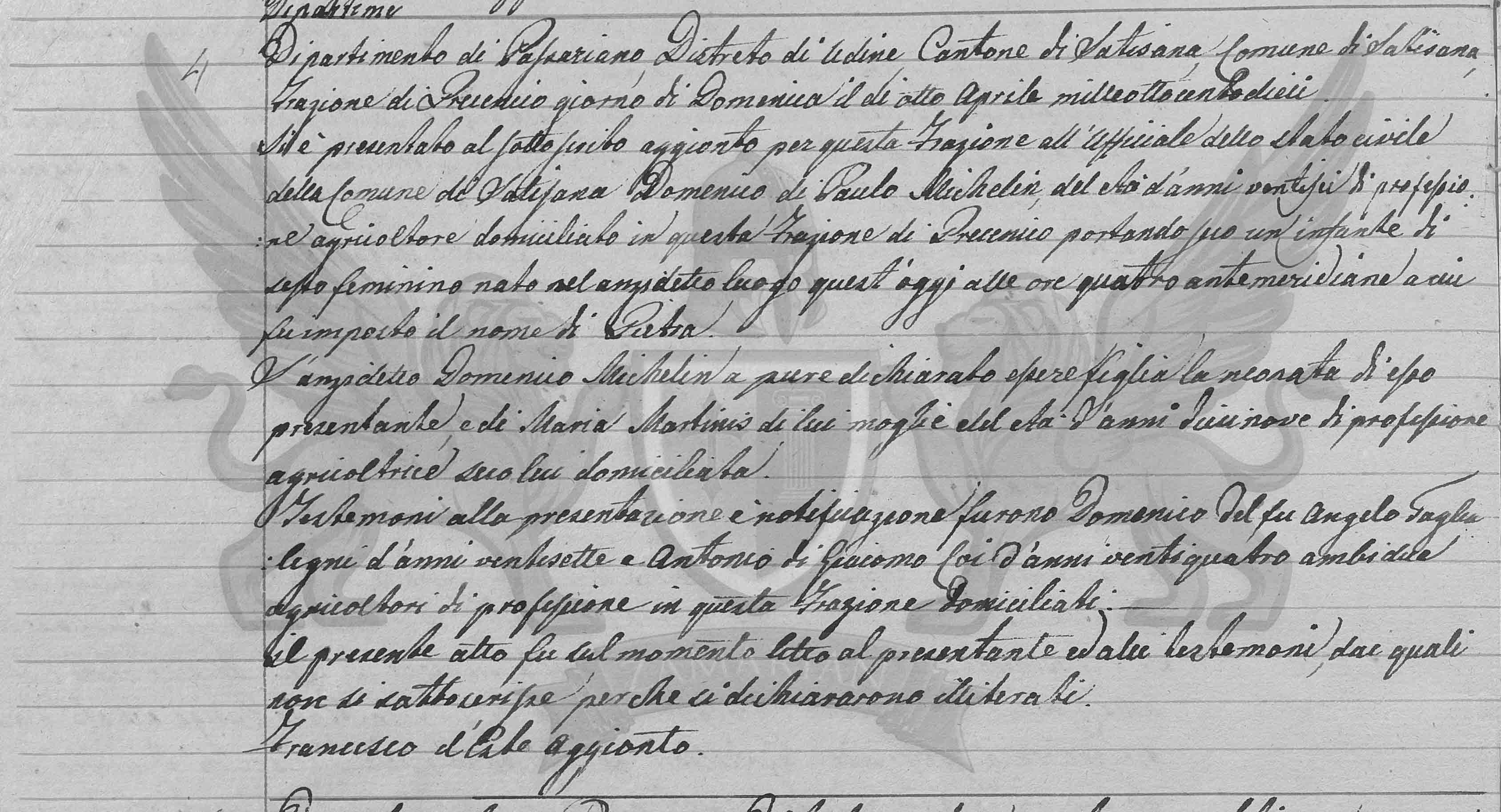 Se apresentou ao subscrito adjunto por esta Fração ao Oficial do Estado Civil do Município de Latisana Domenico filho de Paulo Michelin de idade de vinte e seis anos de profissão agricultor domiciliado nesta Fração de Precenicco portando um infante de sexo feminino nascido no já citado lugar neste dia de hoje às quatro horas anti meridianas ao qual foi imposto o nome de Pietra.