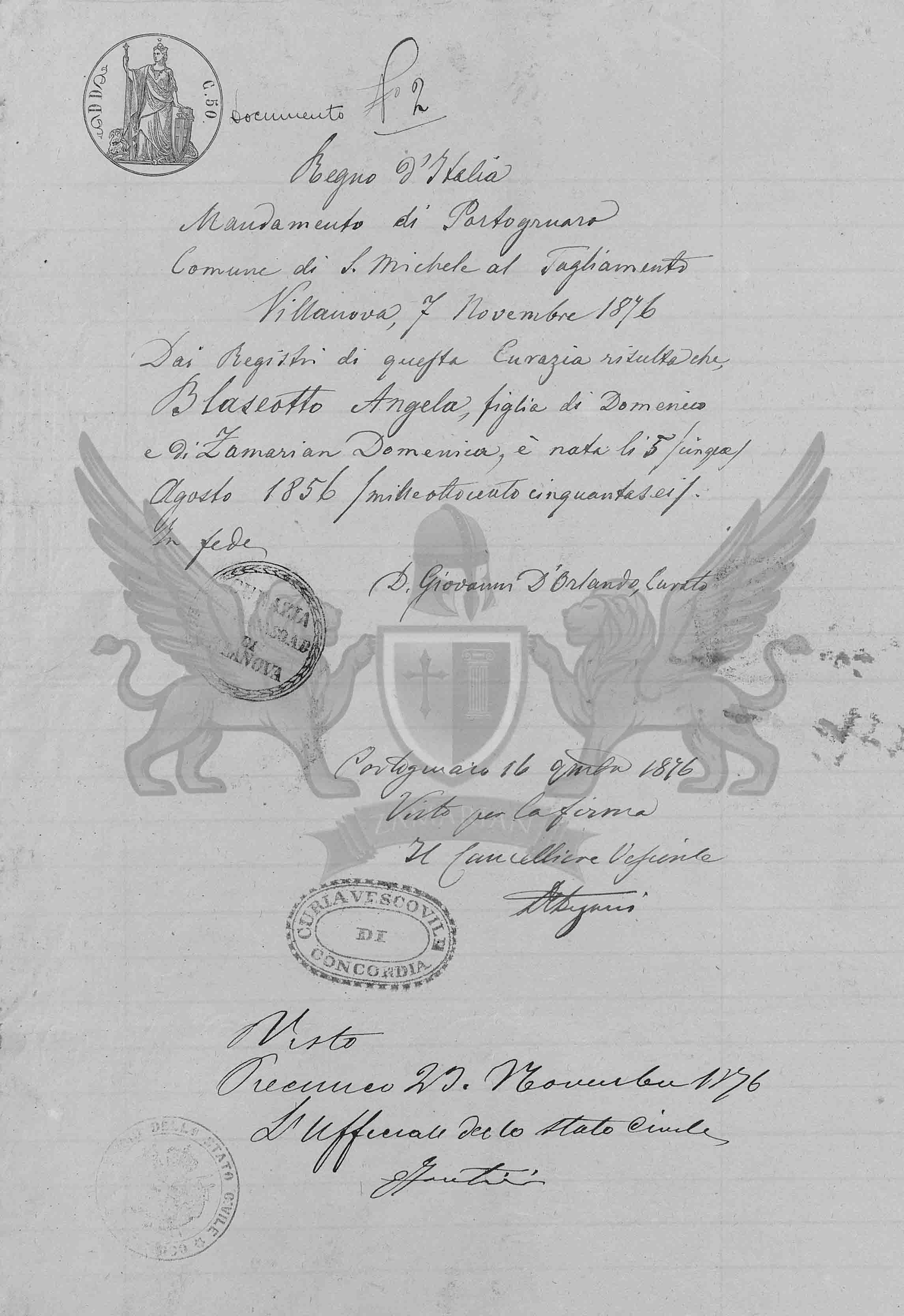Dos Registros desta Curia resulta que, Blaseotto Angela, filha de Domenico e de Zamarian Domenica, nasceu dia 5 /cinco/ de Agosto de 1856 /mil oitocentos e cinquenta e seis/.