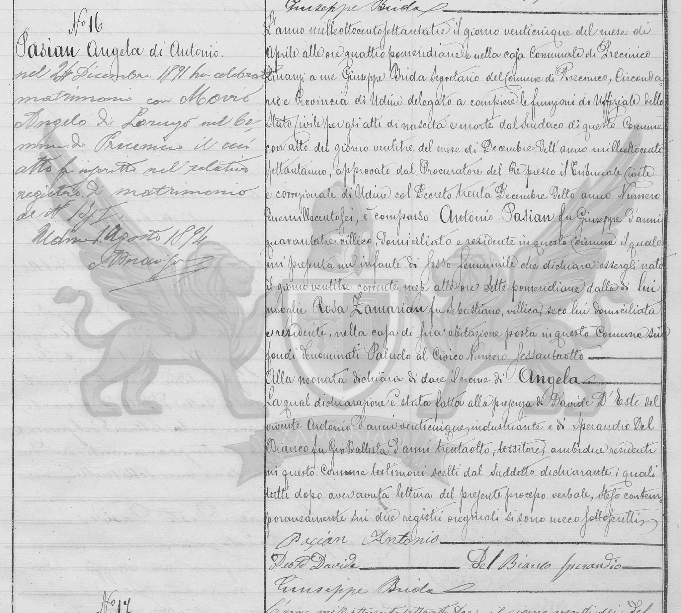 Ano de mil oitocentos e setenta e três, dia vinte e cinco do mês de abril às pós meridianas quatro horas na casa Municipal de Precenicco diante de mim Giuseppe Brida Secretário do Município de Precenicco, Circundário e Província de Udine, delegado a cumprir as funções de Oficial do Estado Civil para atos de nascimento e falecimento pelo Síndico deste Município com ato do dia vinte e três do mês de Dezembro do ano de mil oitocentos e setenta e um, aprovado pelo Procurador do Rei junto ao Tribunal Civil e correcional de Udine com Decreto de trinta de Dezembro do citado ano Número Dois mil cento e seis, compareceu Antonio Pasian, filho do finado Giuseppe de quarenta e três anos, camponês, domiciliado e residente neste Município o qual me apresenta um infante de sexo feminino que declara ter nascido no dia vinte e três do corrente mês às pós meridianas sete horas da sua mulher Rosa Zamarian, filha do finado Sebastiano, camponesa, com ele convivente, domiciliada e residente, na casa de sua habitação situada neste Município sob os fundos denominados Paludo ao Cívico Número setenta e oito. À neonata declara de dar o nome de Angela.