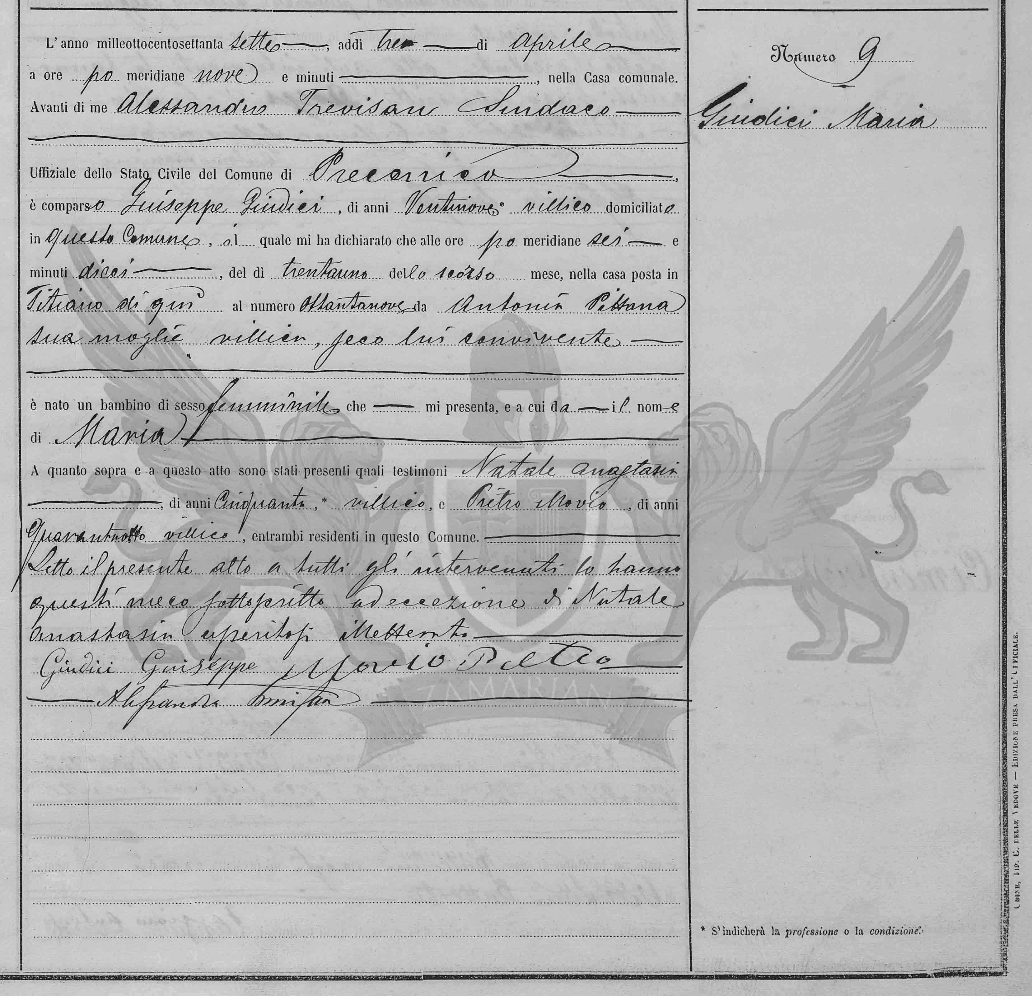 Diante de mim Alessandro Trevisan Síndico Oficial do Estado Civil do Município de Precenicco, compareceu Giuseppe Giudici, de vinte e nove anos, camponês, domiciliado neste Município, o qual me declarou que às pós-meridiana seis horas e dez minutos da manhã, do dia trinta e um do mês passado, na casa situada em Titiano daqui ao número oitenta e nove, de Antonia Pittana, sua mulher, camponesa, com ele convivente nasceu uma criança de sexo feminino que me apresenta, e a qual dá o nome de Maria.
