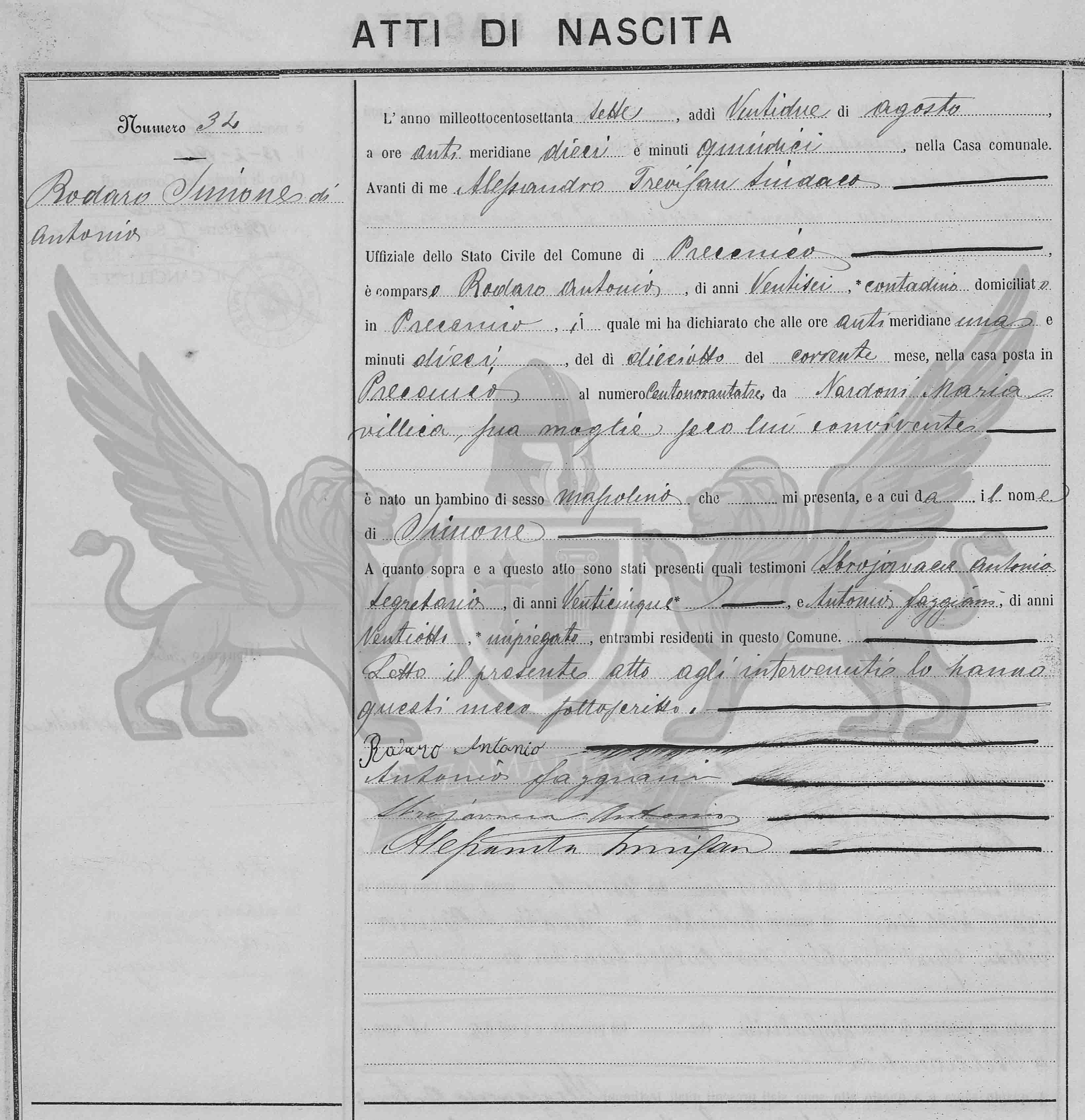Diante de mim Alessandro Trevisan Síndico Oficial do Estado Civil do Município de Precenicco, compareceu Rodaro Antonio, de vinte e seis anos, *camponês, domiciliado em Precenicco, o qual me declarou que às anti meridiana uma hora e dez minutos do dia dezoito do corrente mês, na casa situada em Precenicco ao número cento e noventa e três, de Nardoni Maria, camponesa, sua mulher com ele convivente nasceu uma criança de sexo masculino que me apresenta, a qual dá o nome de Simone.