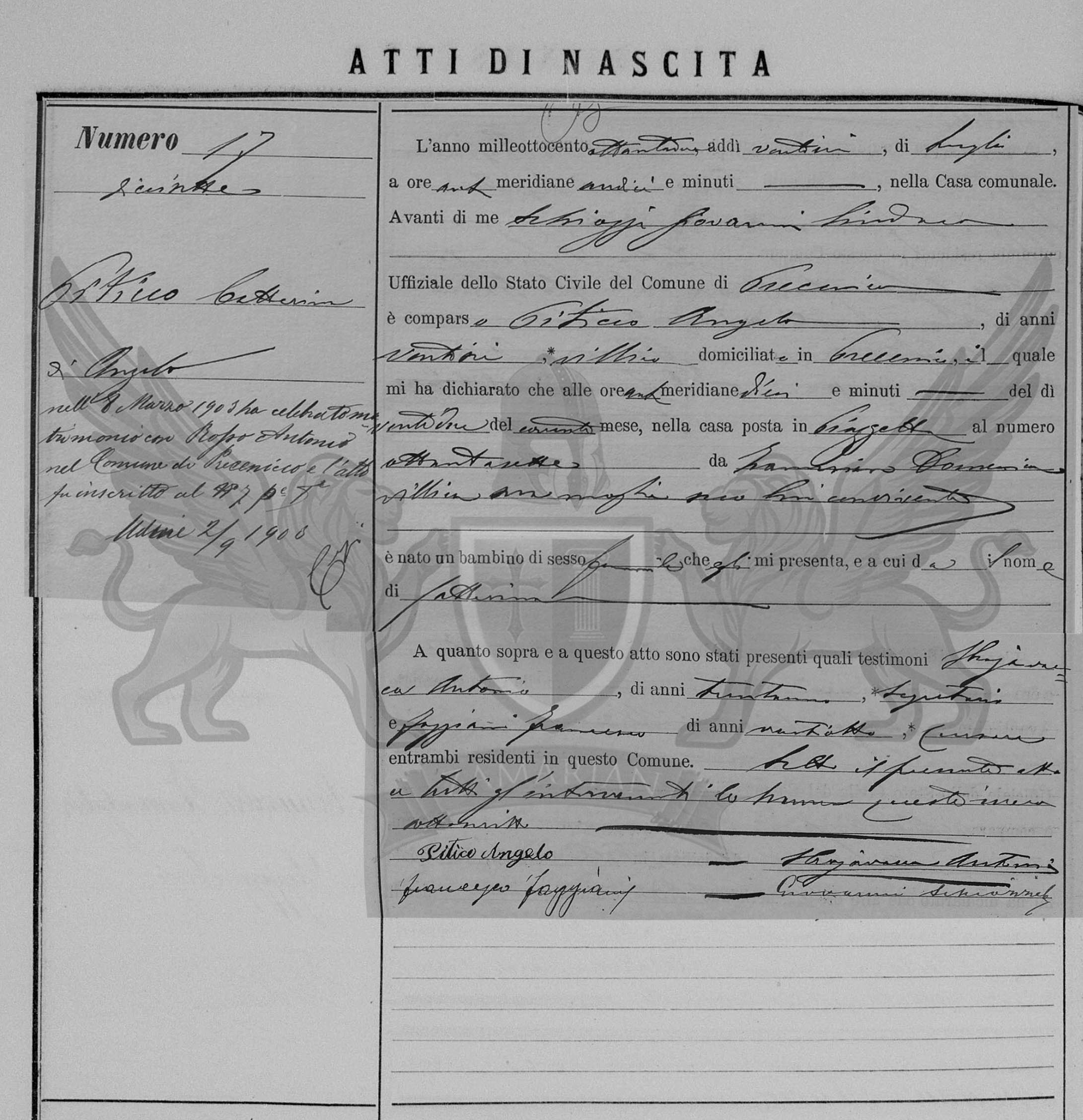 Diante de mim Schiozzi Giovanni Síndico Oficial do Registro Civil do Município de Precenicco, compareceu Piticco Angelo, de vinte e seis anos, camponês, domiciliado em Precenicco, o qual me declarou que às ante meridiana dez horas do dia vinte e dois do corrente mês, na casa situada em Piazzetta ao número oitenta e sete, de Zamarian Domenica, camponesa, sua mulher, com ele convivente nasceu uma criança de sexo feminino que ele me apresenta, e ao qual dá o nome de Catterina.