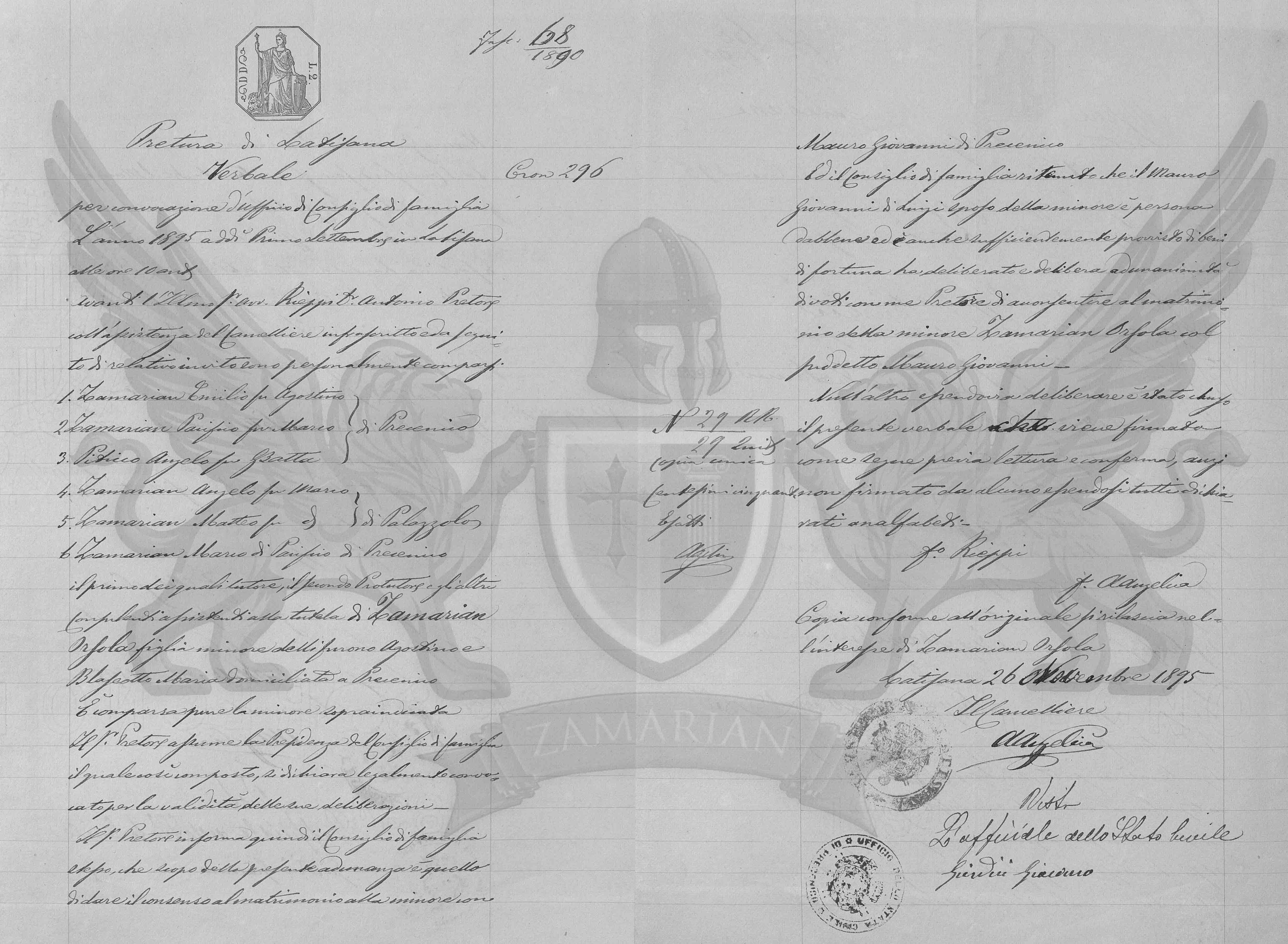 O primeiro dos quais tutor, o segundo pró tutor e os outros consulentes à tutela de Zamarian Orsola filha menor dos finados Agostino e Blaseotto Maria domiciliada em Precenicco.