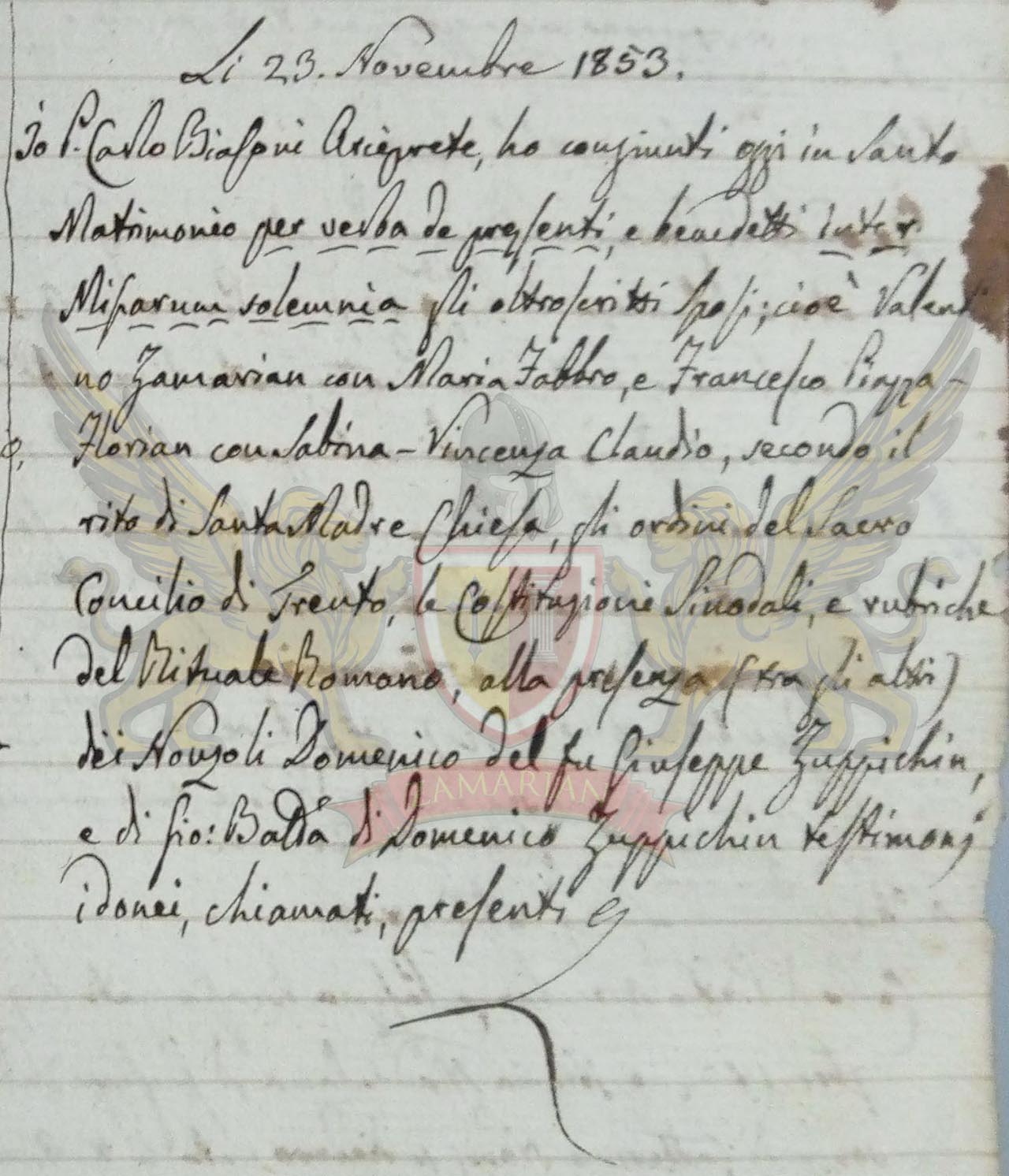 Eu P. Carlo Biasoni conjuguei hoje em Santo Matrimônio por verba dos presentes, e benditas solenidades ininterruptas os subscritos nubentes; isto é Valentino Zamarian com Maria Fabbro, e Francesco Piazza Florian com Sabina-Vincenza Claudio, segundo o rito da Santa Mãe Igreja, às ordens do Sacro Conselho de Trento, as constituições sinodais, e rubricas do Ritual Romano, à presença (entre outros) das testemunhas Domenico filho do finado Giuseppe Zuppichin, e de Giovanni Battista filho de Domenico Zuppichin, idôneos, convidados, presentes