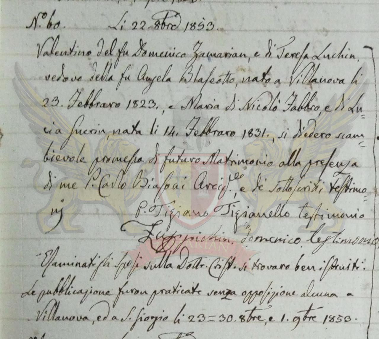 Valentino filho do finado Domenico Zamarian, e de Teresa Lucchin viúvo da finada Angela Blaseotto, nascido em Villanova dia 23 de fevereiro de 1823, e Maria filha de Nicolò Fabbro, e de Lucia Guerin, nascida dia 14 de fevereiro de 1831, trocaram promessa de futuro Matrimônio na minha presença P. Carlo Biasoni Arcepréte, e das subscritas testemunhas