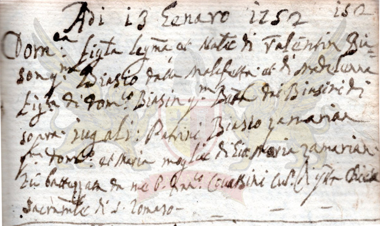 Domenica filha legítima Nascida de Valentin Biason (filho) do falecido Biasio de Malafesta e de Madalena filha de Domenico Biasin (filho) do falecido Battista de Biasini supra cônjuges. Padrinhos Biasio Zamarian (filho) do falecido Domenico; e Maria mulher de Giovanni Maria Zamarian. Foi batizada por mim Pároco Francesco Covassini Curato desta Igreja Sacramental de San Tomaso.