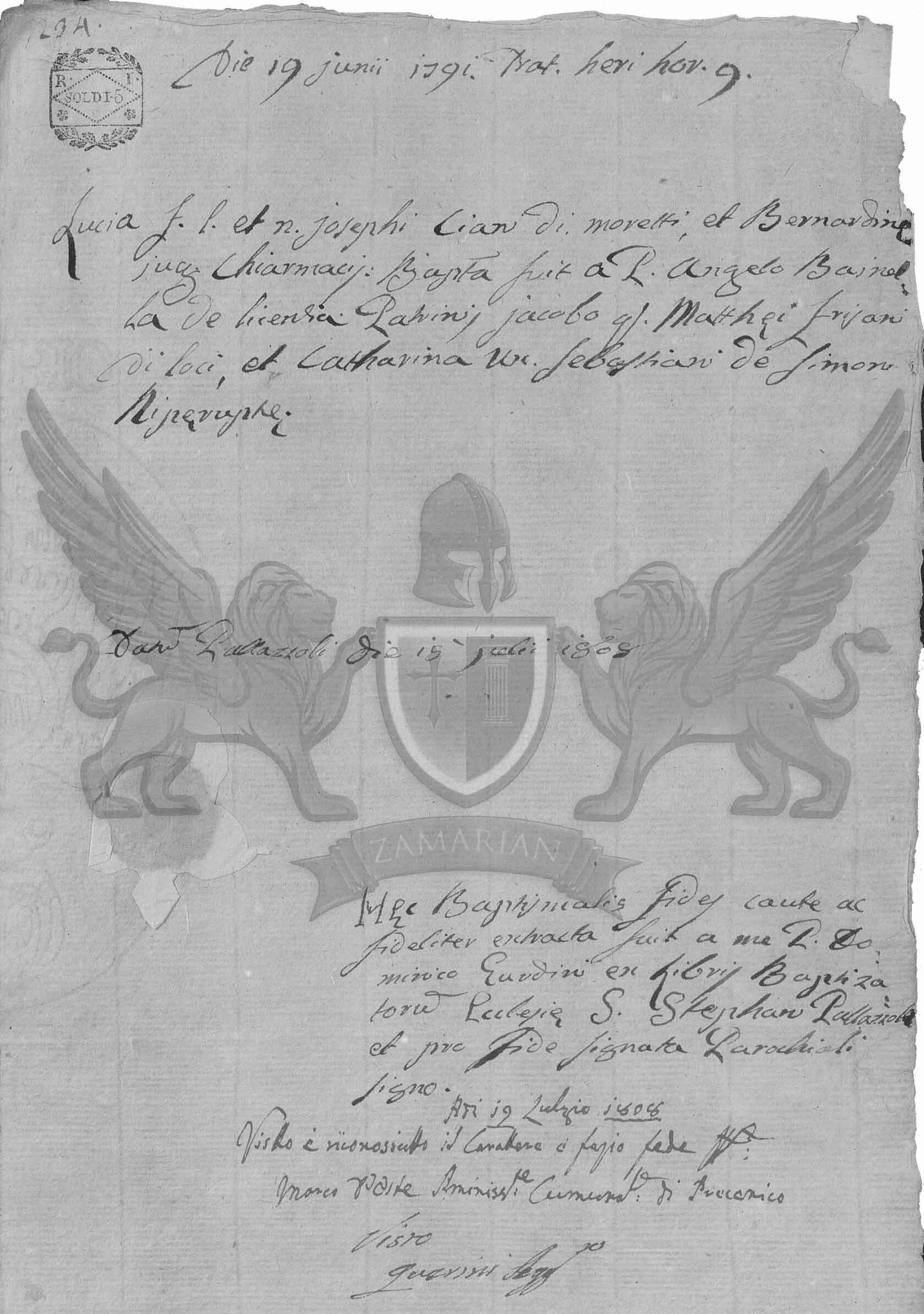 Lucia filha legítima e natural de Josephi Cian de Moretti, e Bernardina cônjuges, foi batizada por mim padre Angelo Bainella pároco. Foram padrinhos Jacobo chamado Matthei Frisani, e Catharina Sebastiani.