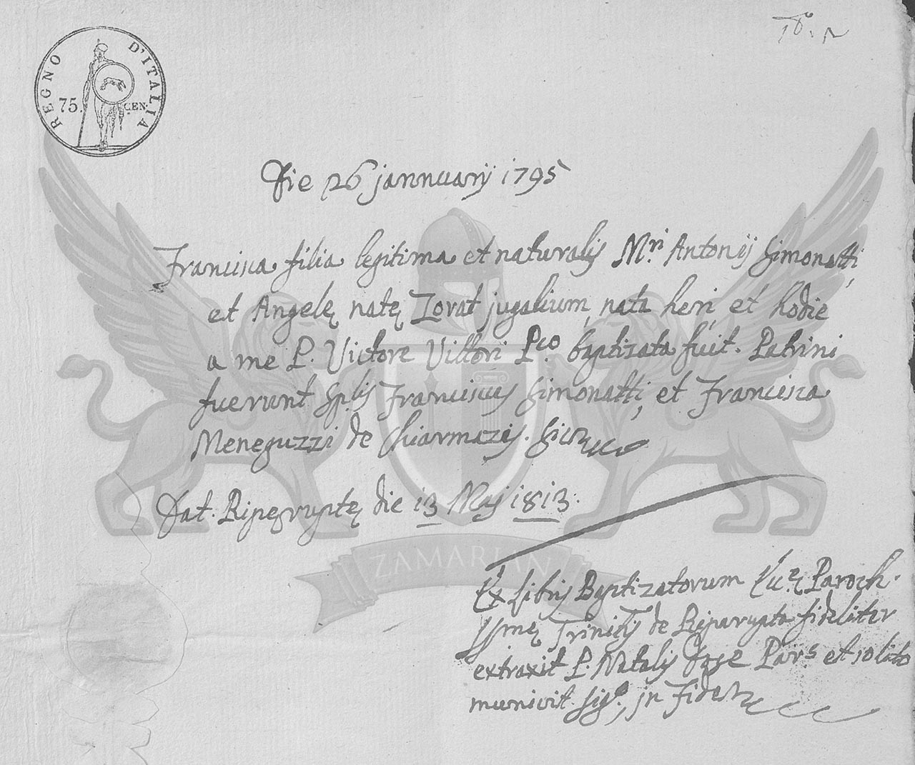 Francesca filha legítima e natural de senhor Antonio Simonatti e Angela Zorat cônjuges, nascida ontem foi batizada por mim padre Vittore Vittori pároco. Foram padrinhos os senhores Francesco Simonatti e Francesca Meneguzzo desta paróquia